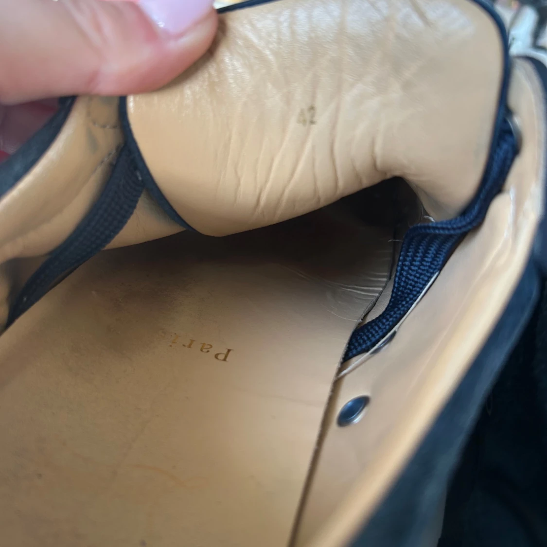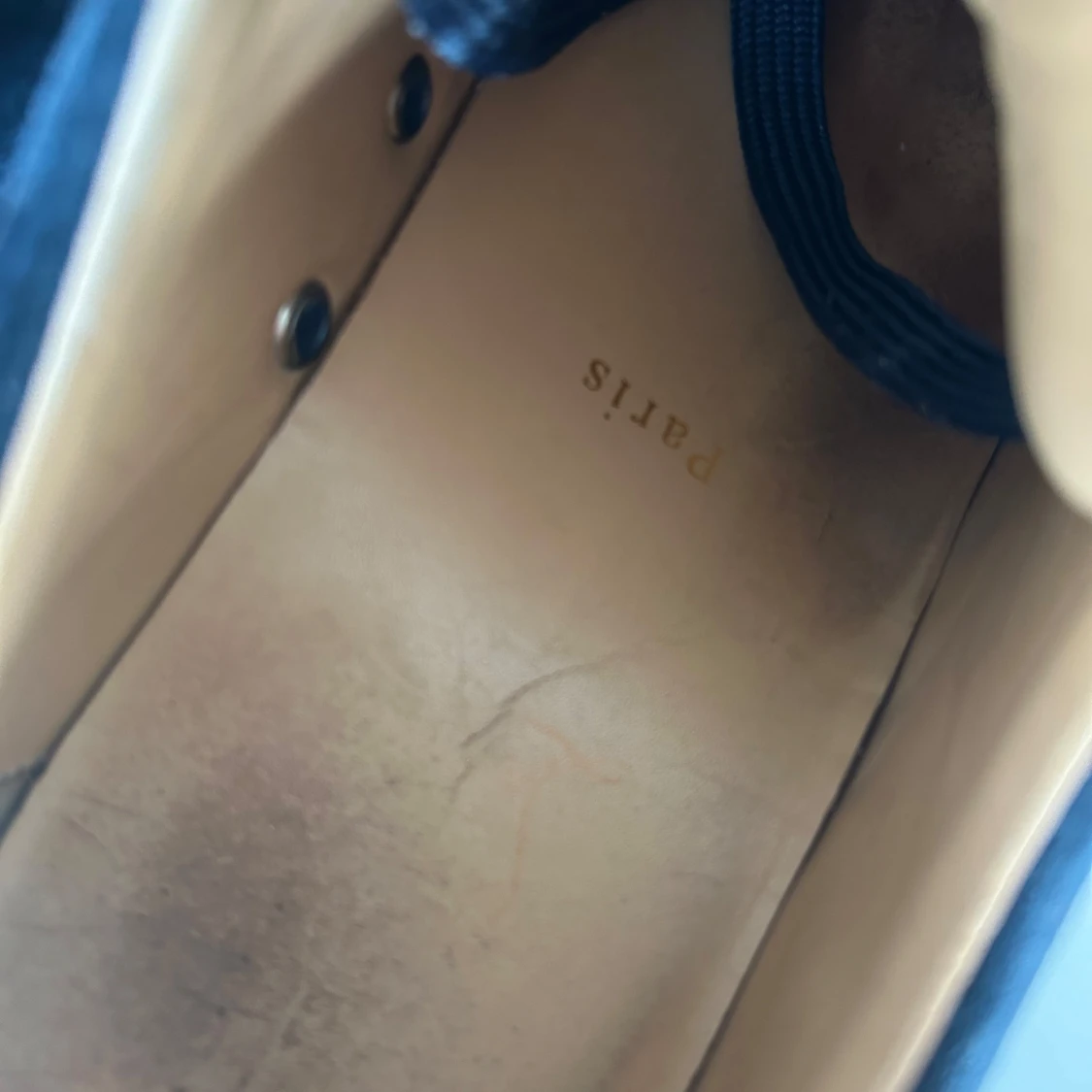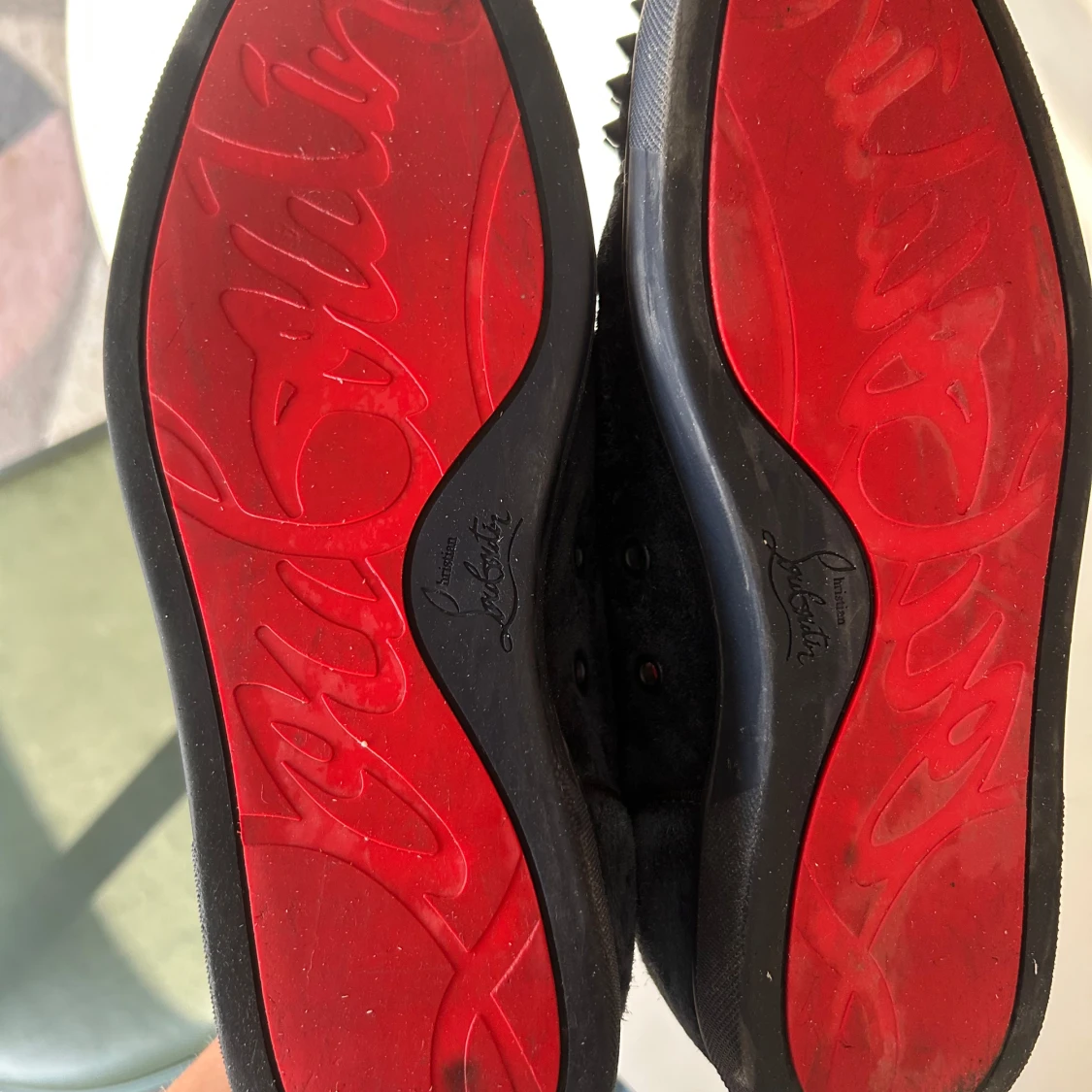 Säljer ett par mörkblå sneakers i mocka från Christian Louboutin med röda sulor och mörkblå nitar på tån. Skorna har snörning och rund tå, samt läderfoder. Skorna är lätt slitna men i väldigt bra skick. Storlek 43. 42 fransk storlek