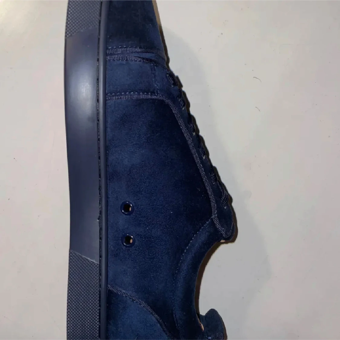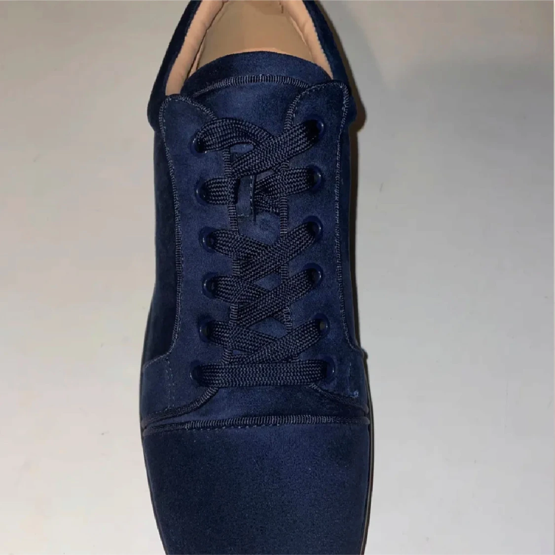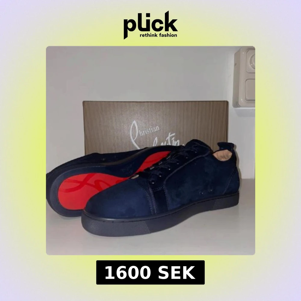 Säljer ett par mörkblå sneakers från Christian Louboutin med klassisk röd sula. Skorna har snörning och är tillverkade i mocka med en stilren design. Perfekta för dig som vill ha något exklusivt och snyggt till vardags.