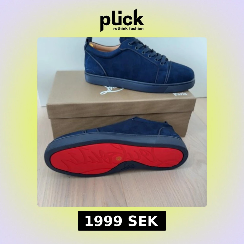 Snygga mörkblå sneakers från Christian Louboutin i mocka med klassisk röd sula och diskreta detaljer. Skorna har rund tå, snörning och platt sula. Perfekta för dig som vill sticka ut med exklusiv stil och ikonisk design. Storlek 41. Fick den som en present men den är för liten för mig