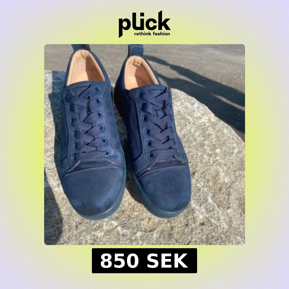 Snygga mörkblå sneakers från Christian Louboutin i mocka med klassiska röda sulor. Skorna har rund tå, platt sula och snörning framtill. Insidan är ljusbeige och de har en stilren, minimalistisk design som sticker ut med den ikoniska röda undersidan.