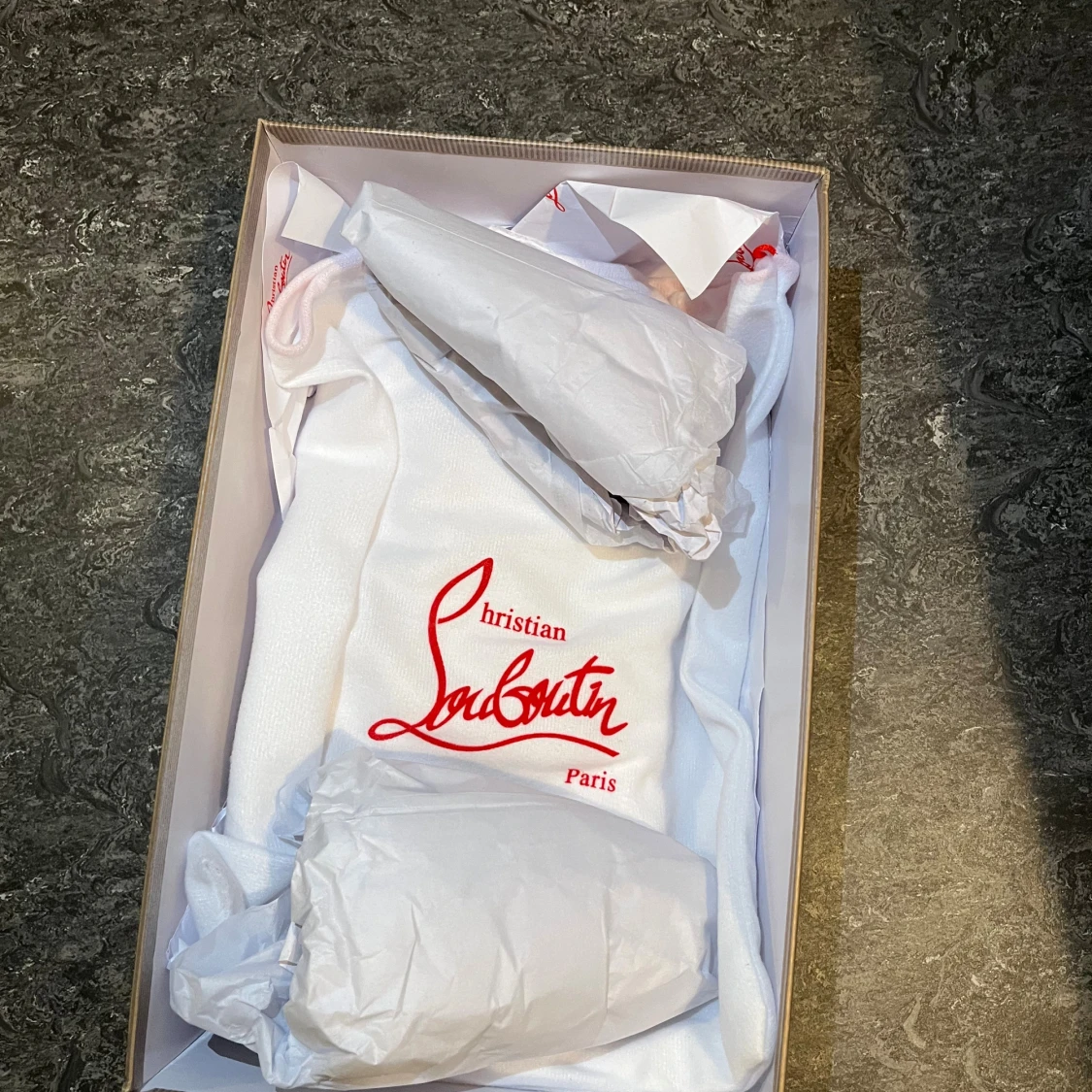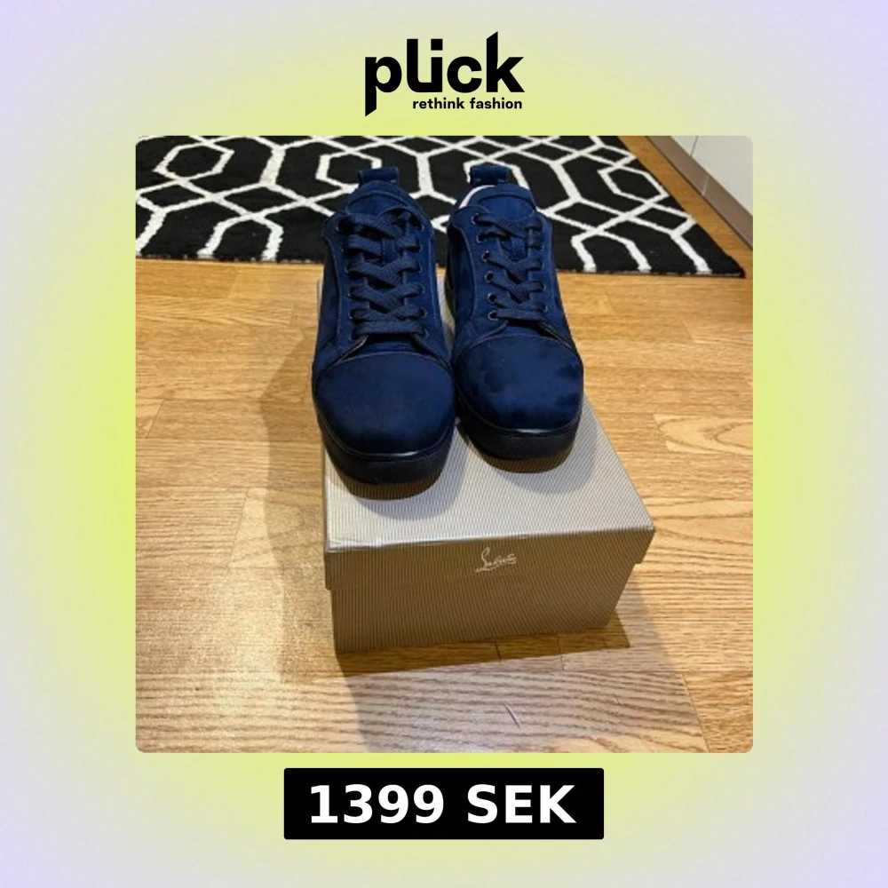 Snygga mörkblå sneakers från Christian Louboutin i mocka med klassisk röd sula och diskret logga. Skorna har rund tå, snörning och en stilren design som sticker ut med den ikoniska röda undersidan. Perfekta för dig som vill ha något exklusivt och trendigt.