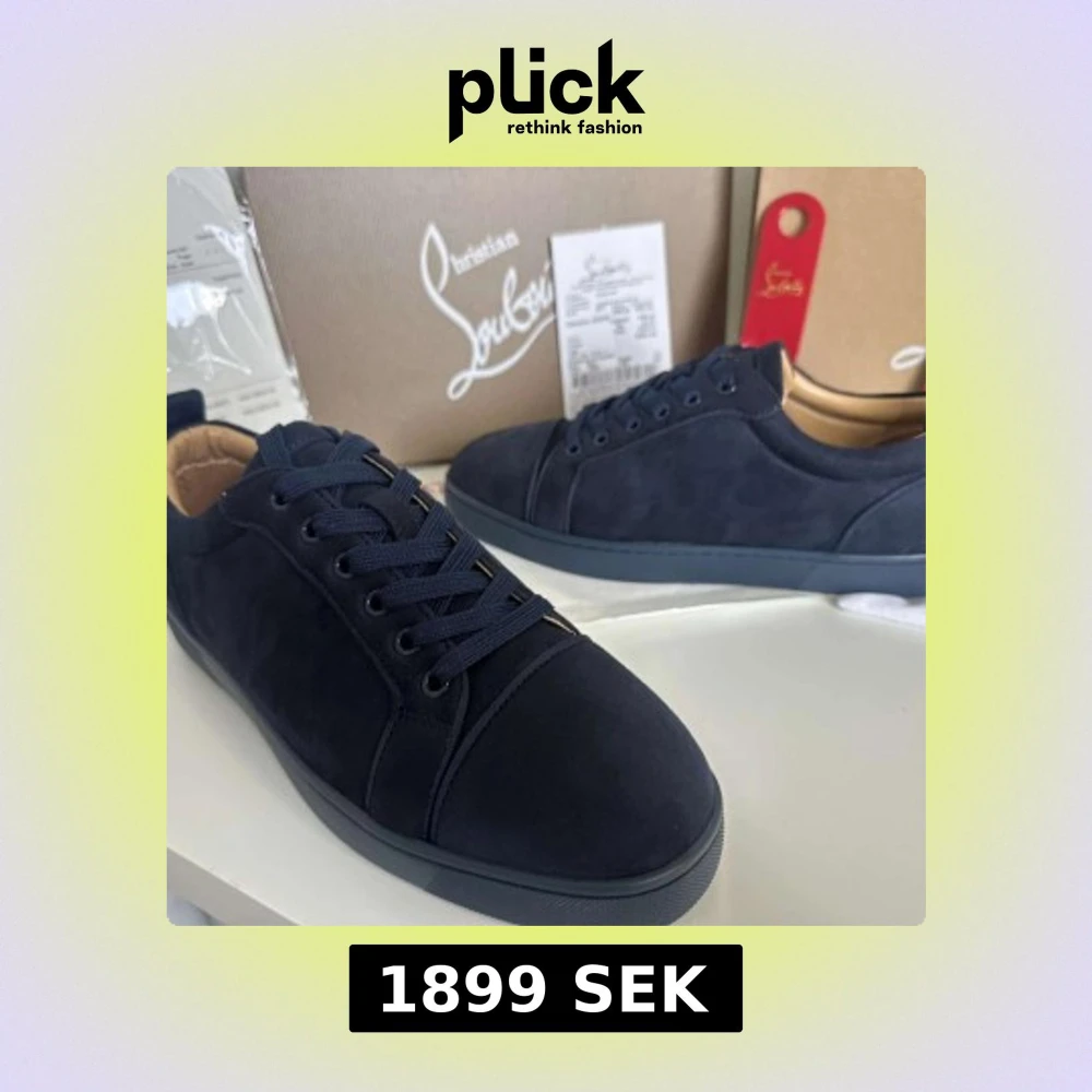 Snygga mörkblå sneakers från Christian Louboutin i mocka med klassisk röd sula och broderad logga på hälen. Skorna har rund tå, platt sula och matchande mörkblå snörning. Insidan är fodrad i beige skinn för extra komfort. Perfekt för dig som gillar exklusiv streetstyle.