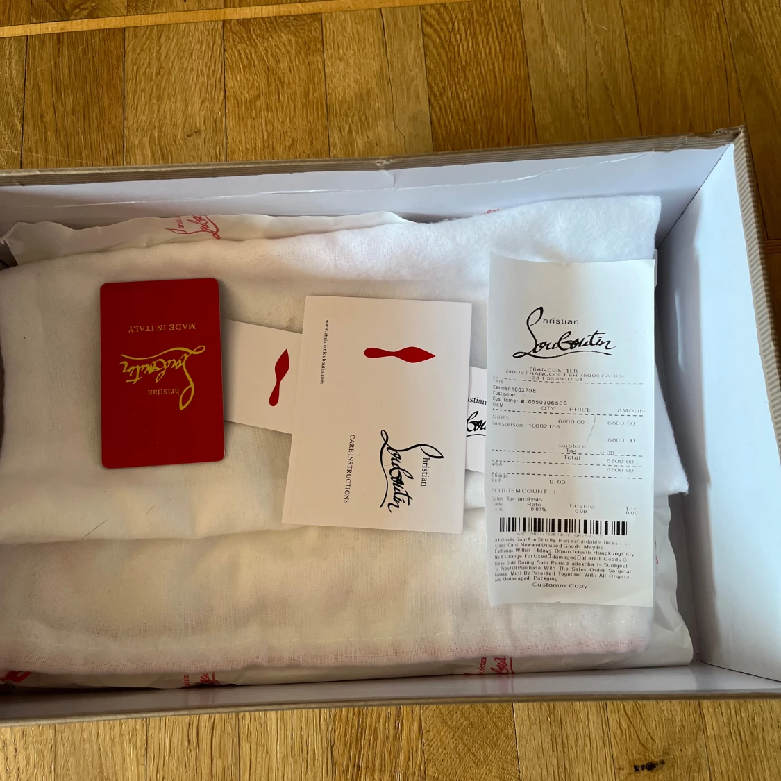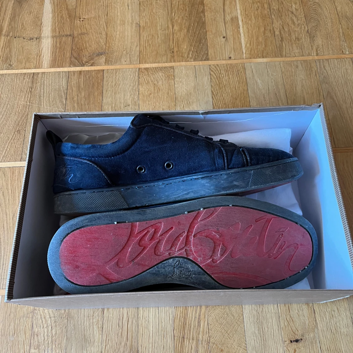 Säljer ett par mörkblå sneakers från Christian Louboutin med klassisk röd sula och svarta snören. Skorna har rund tå och är tillverkade i mocka. Perfekta för dig som vill ha en stilren och lyxig look.