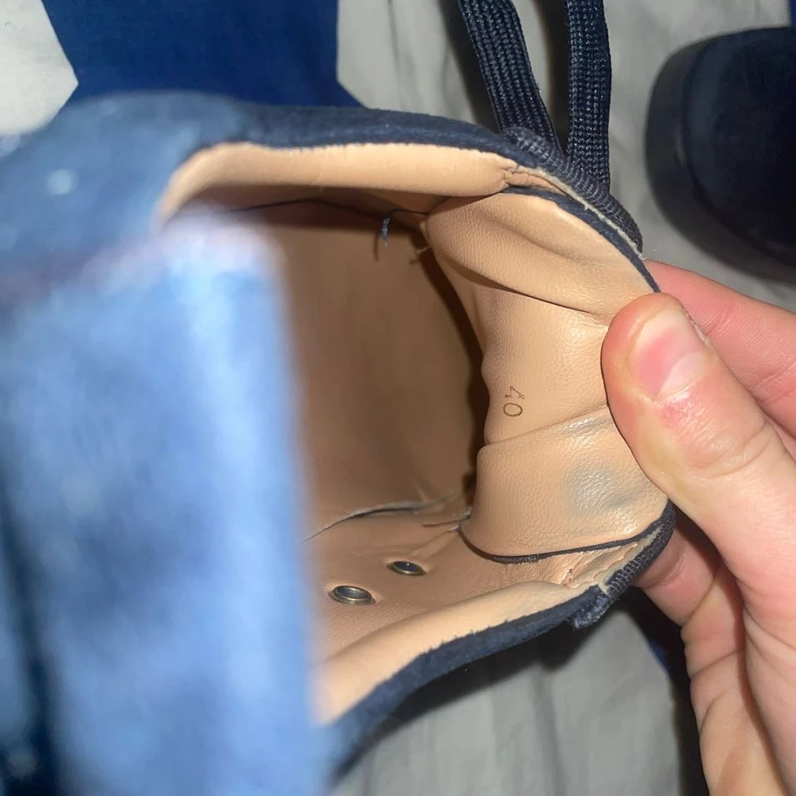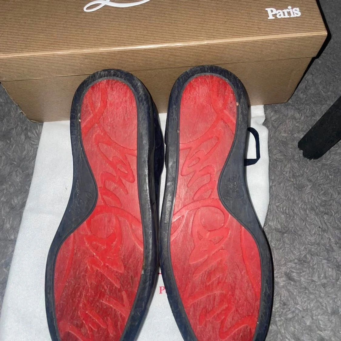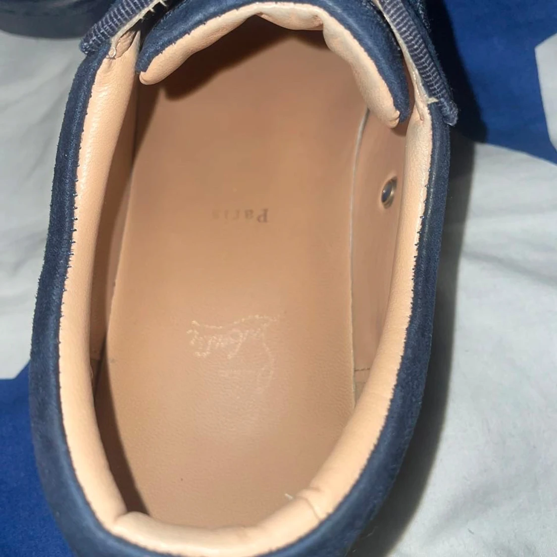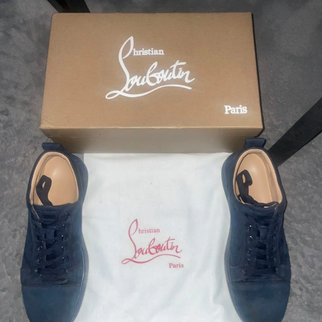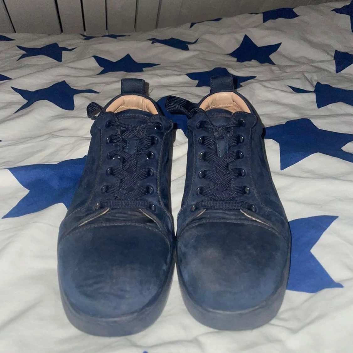Snygga mörkblå sneakers från Louboutin med klassisk röd sula. Skorna har snörning och är tillverkade i mocka med en stilren design. Perfekta för en trendig look.