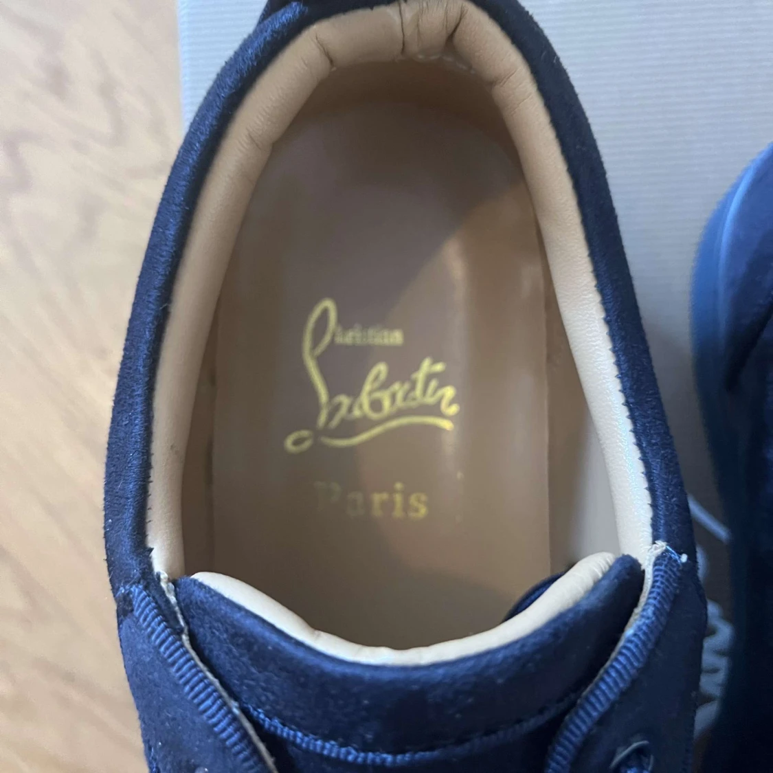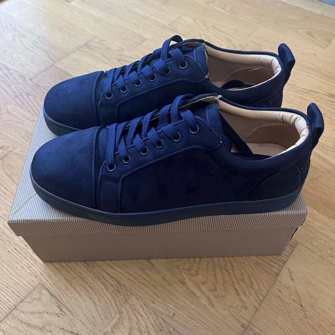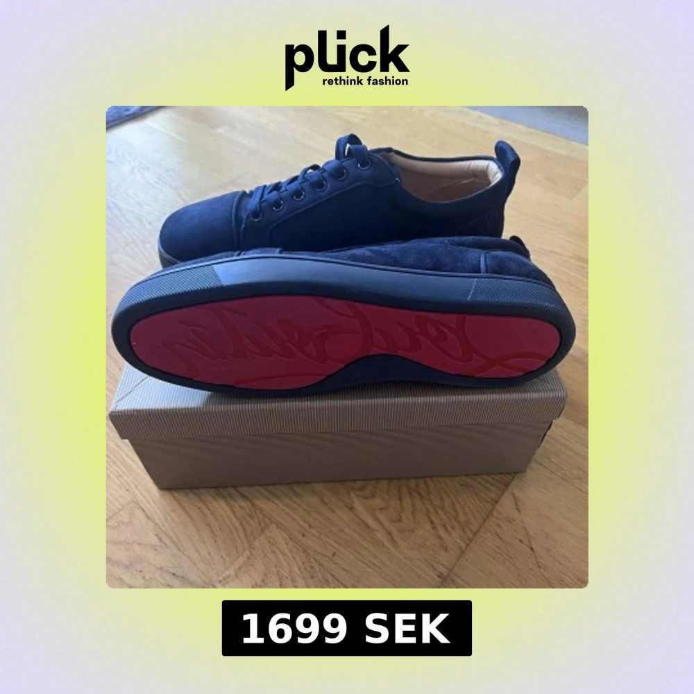 Snygga mörkblå sneakers från Louboutin med lyxig mocka och klassisk röd sula med logotyp. Inte min stil därför säljer jag köpt till skolbalen. Pris kan diskuteras endast använd en kväll