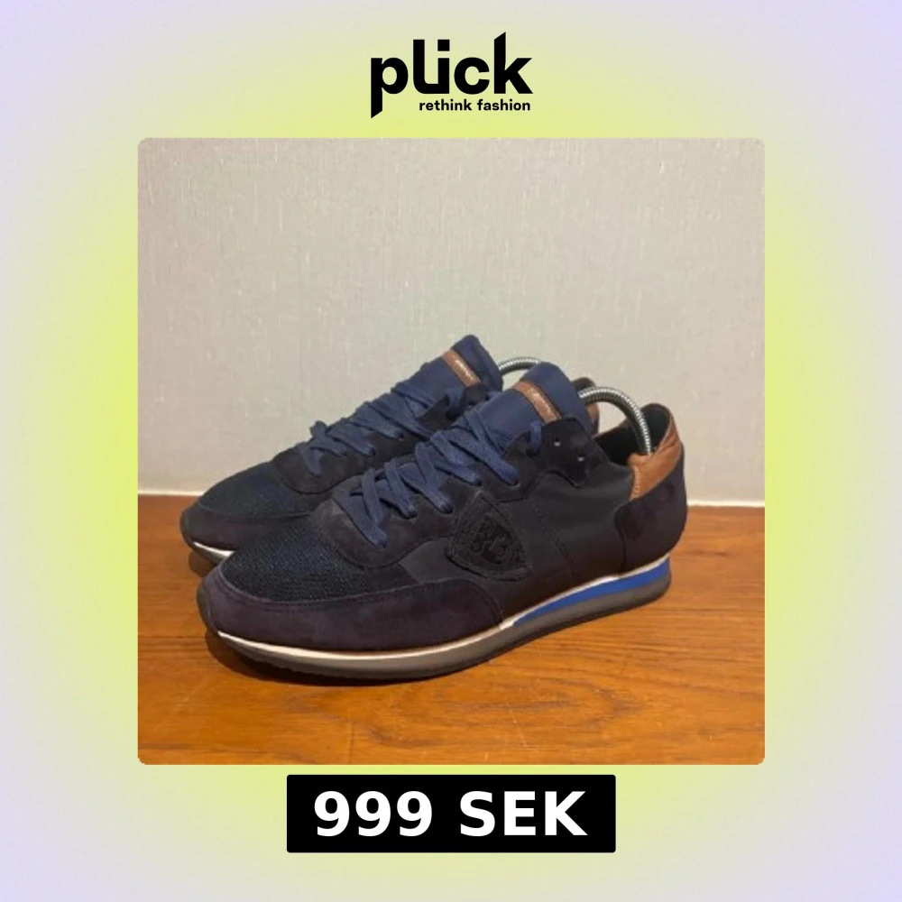 Snygga mörkblå sneakers från Philippe Model med detaljer i brunt skinn vid hälen och på plösen. Ovandelen är en mix av mocka och mesh, med snörning och platt sula. Diskret logga på sidan och blå rand på mellansulan ger en cool touch.