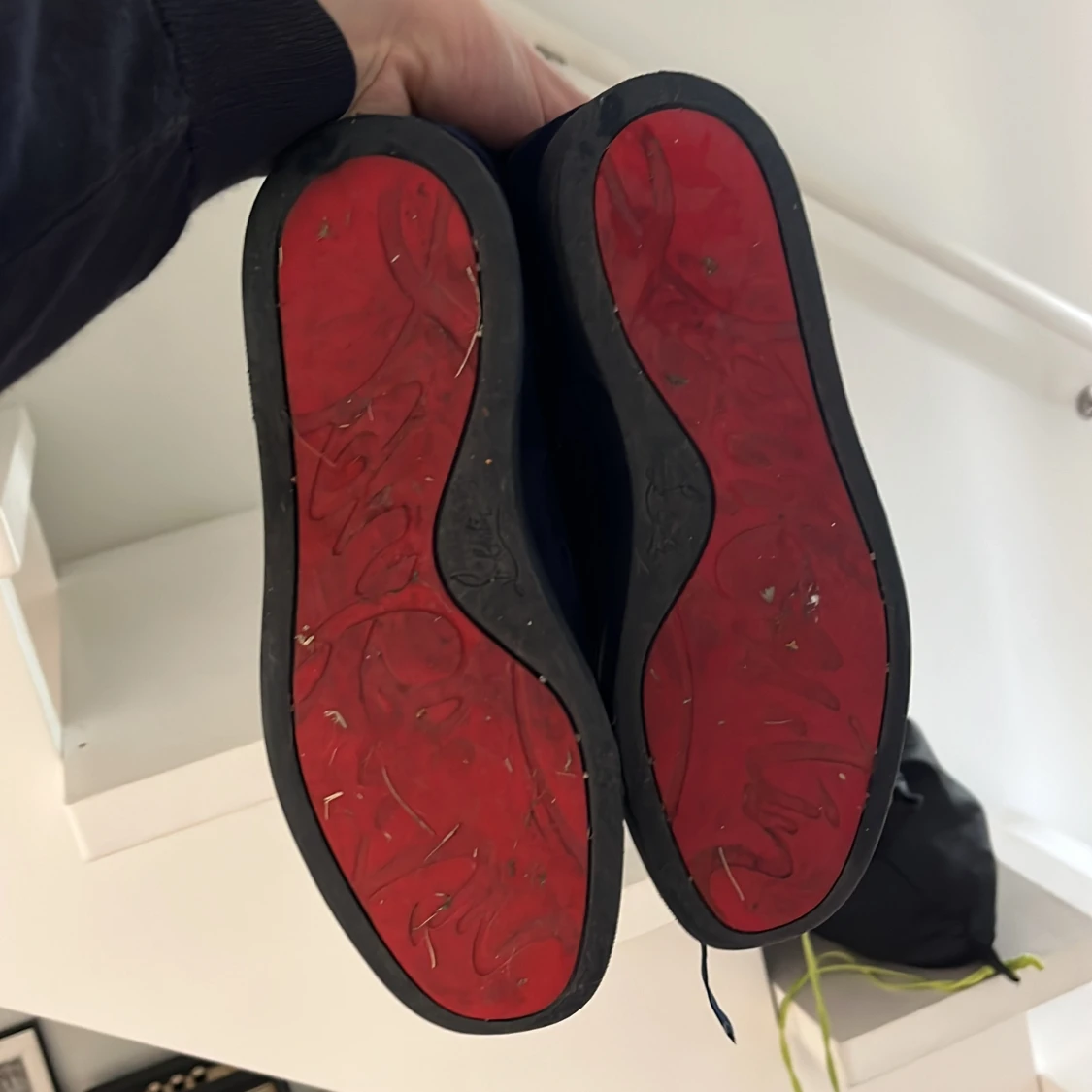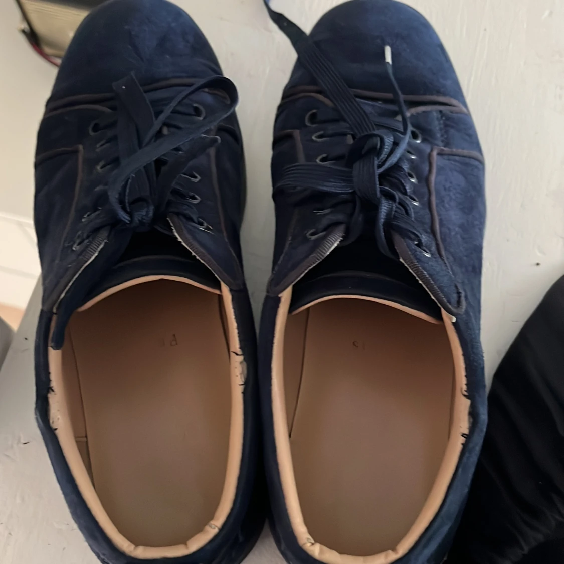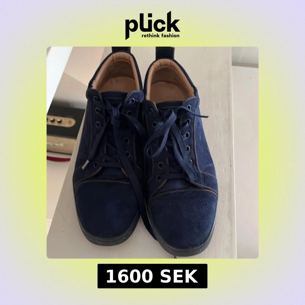 Snygga mörkblå sneakers i mocka med klassisk snörning och rund tå. Skorna har en unik röd sula med mönstrad textur och beige innersida. Perfekta för dig som vill sticka ut med en cool detalj på fötterna.