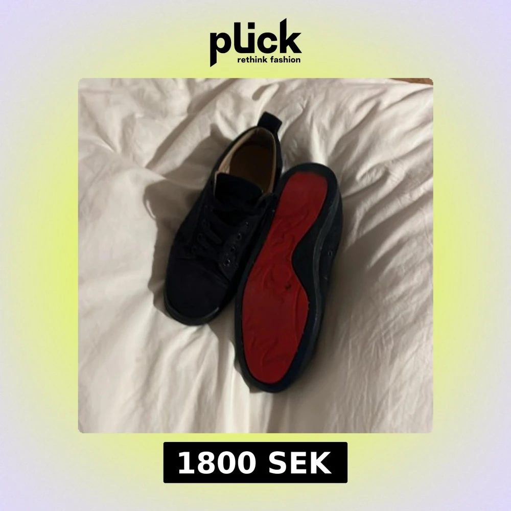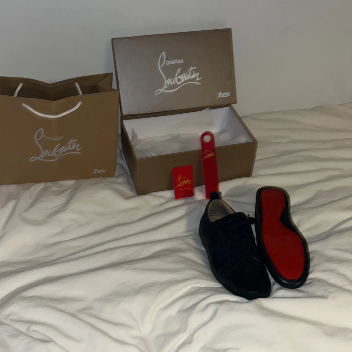 Snygga svarta sneakers från Christian Louboutin med klassisk röd sula. Skorna har rund tå, snörning och är tillverkade i skinn med en lyxig känsla. Perfekt för dig som vill sticka ut med exklusiva detaljer och ikonisk design.