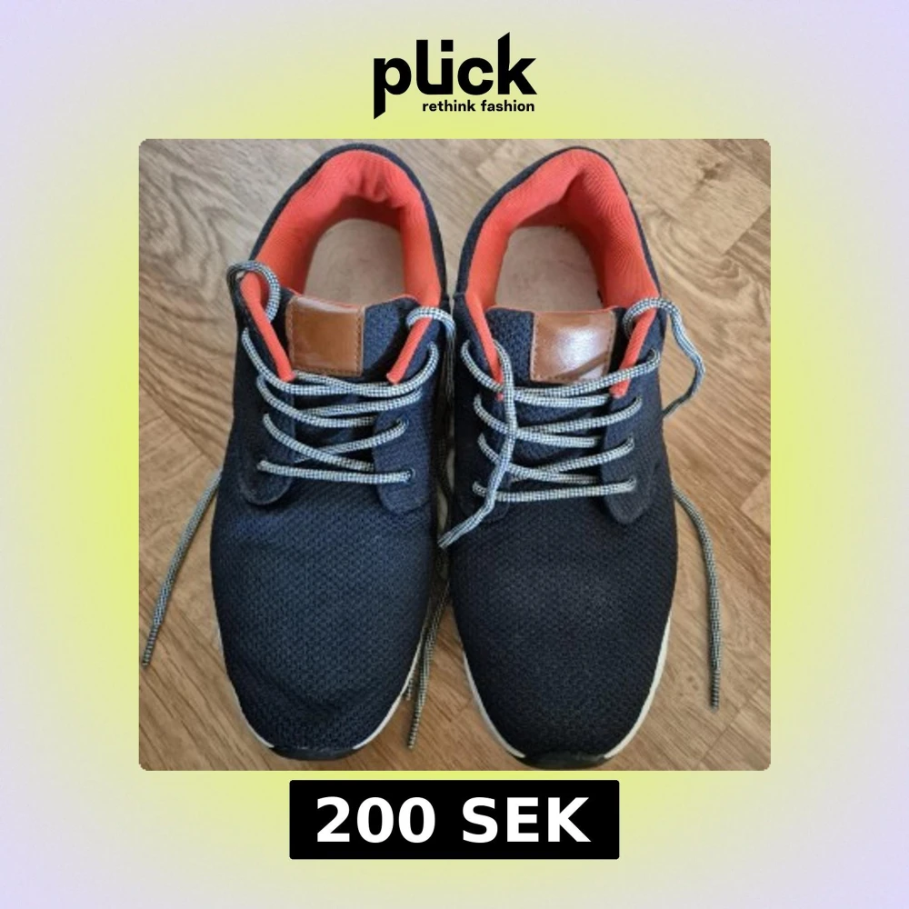Säljer ett par svarta sneakers med mesh-yttermaterial och orange foder. Skorna har vita och svarta snören, vit och svart grov sula samt en brun detalj på plösen. Perfekt för dig som gillar sportig och clean stil.