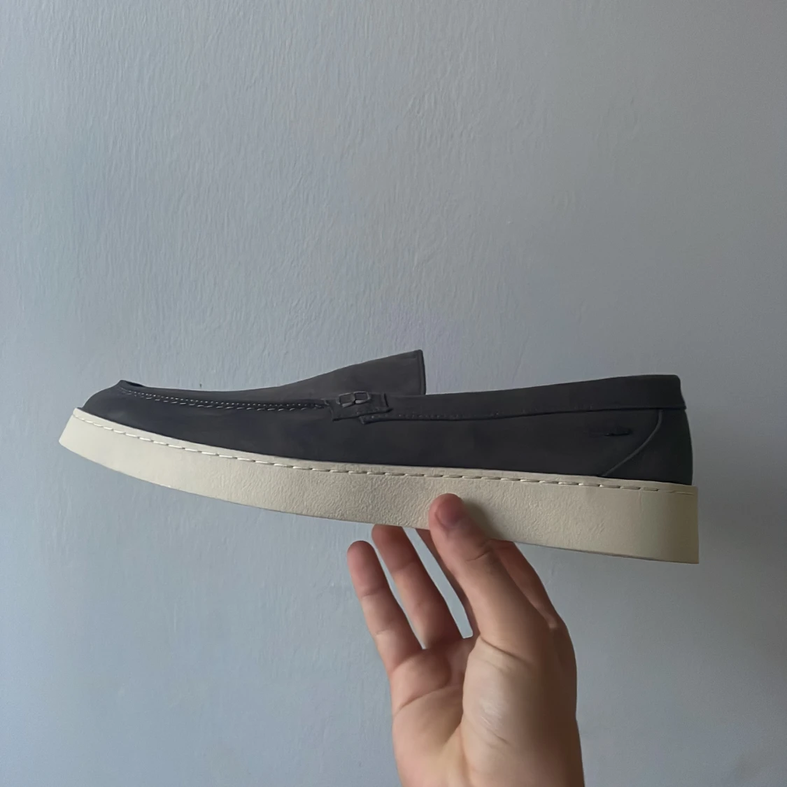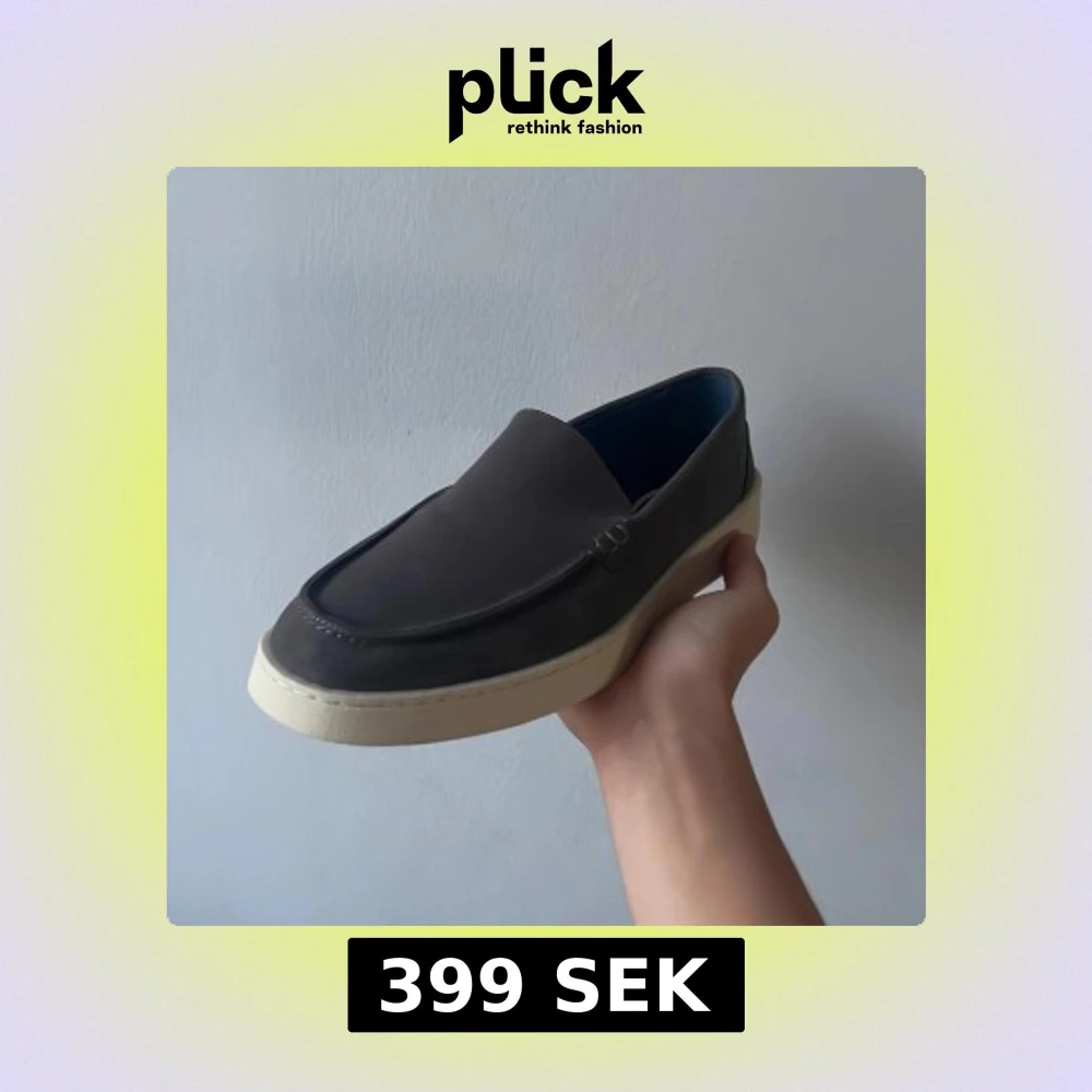 Snygga mörkgrå loafers med stilren design och kontrasterande vit platt sula. Skorna har rund tå och är tillverkade i slätt skinn, vilket ger en clean och modern look. Perfekta för dig som gillar minimalistisk stil.