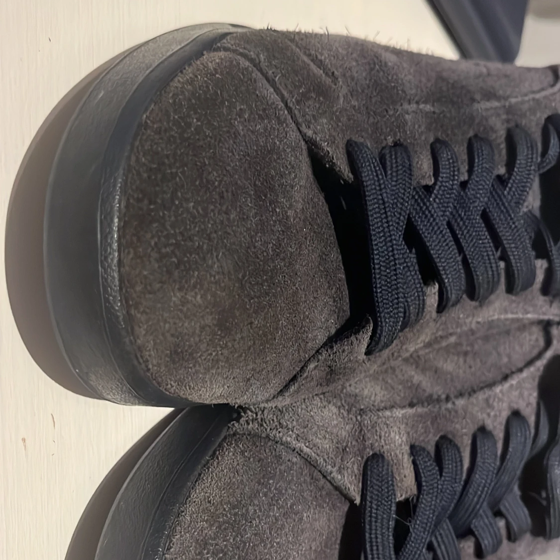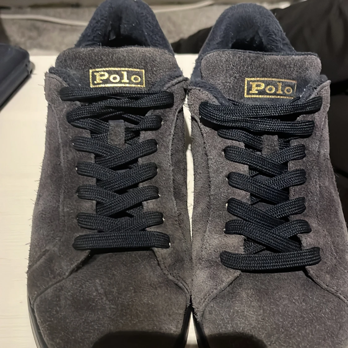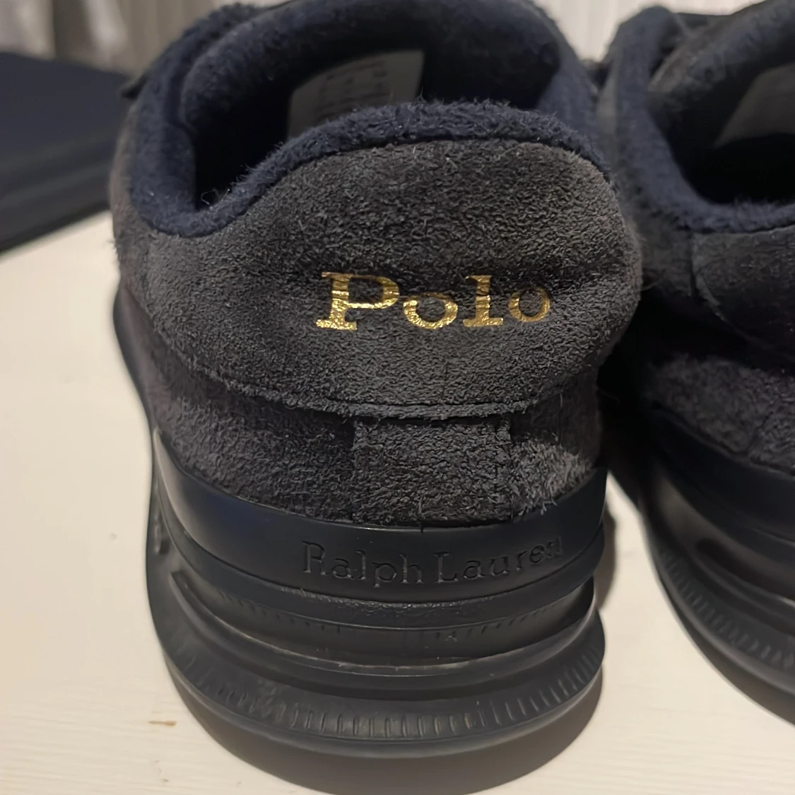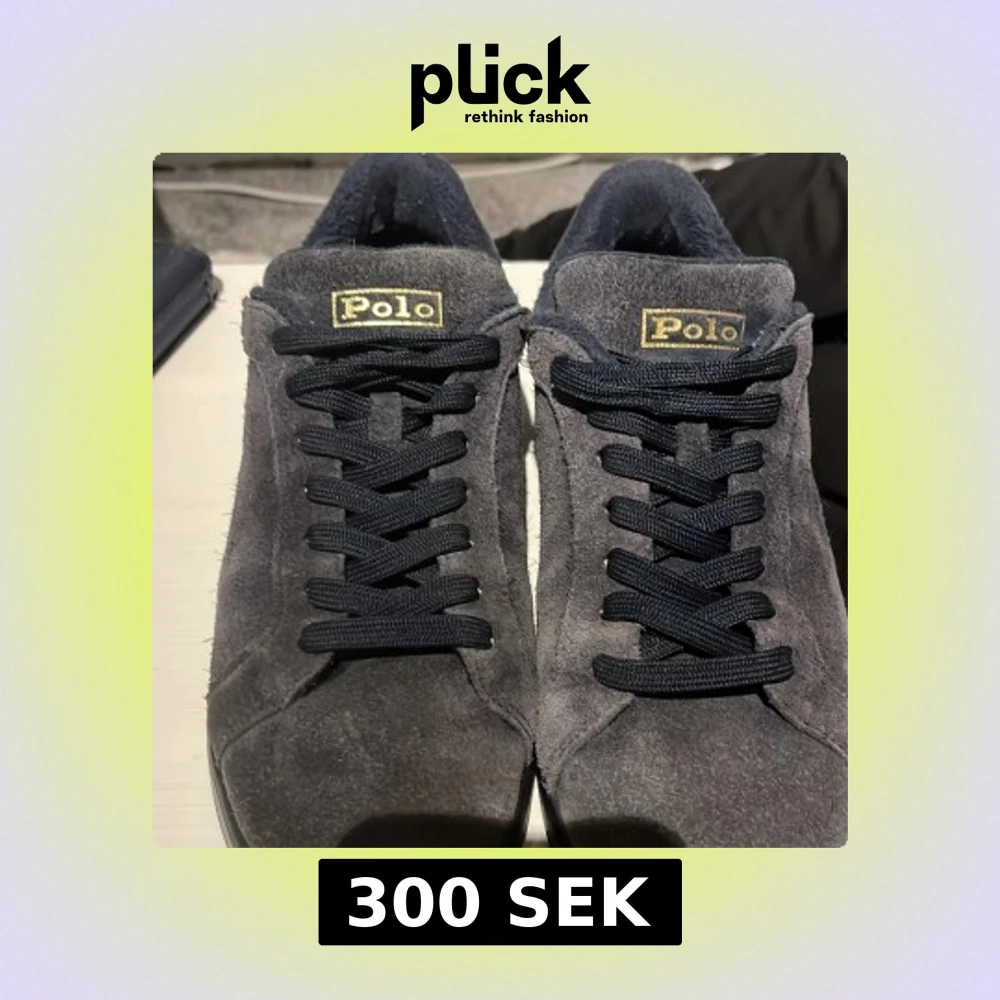 Snygga mörkblåa sneakers från Polo med ovandel i mocka. Skorna har guldiga Polo-loggor både på plösen och hälen. Klassisk låg modell med platt sula och rund tå, perfekt för en stilren och avslappnad look. Färgen lite mer blekt än original men går att putsa upp mockan.