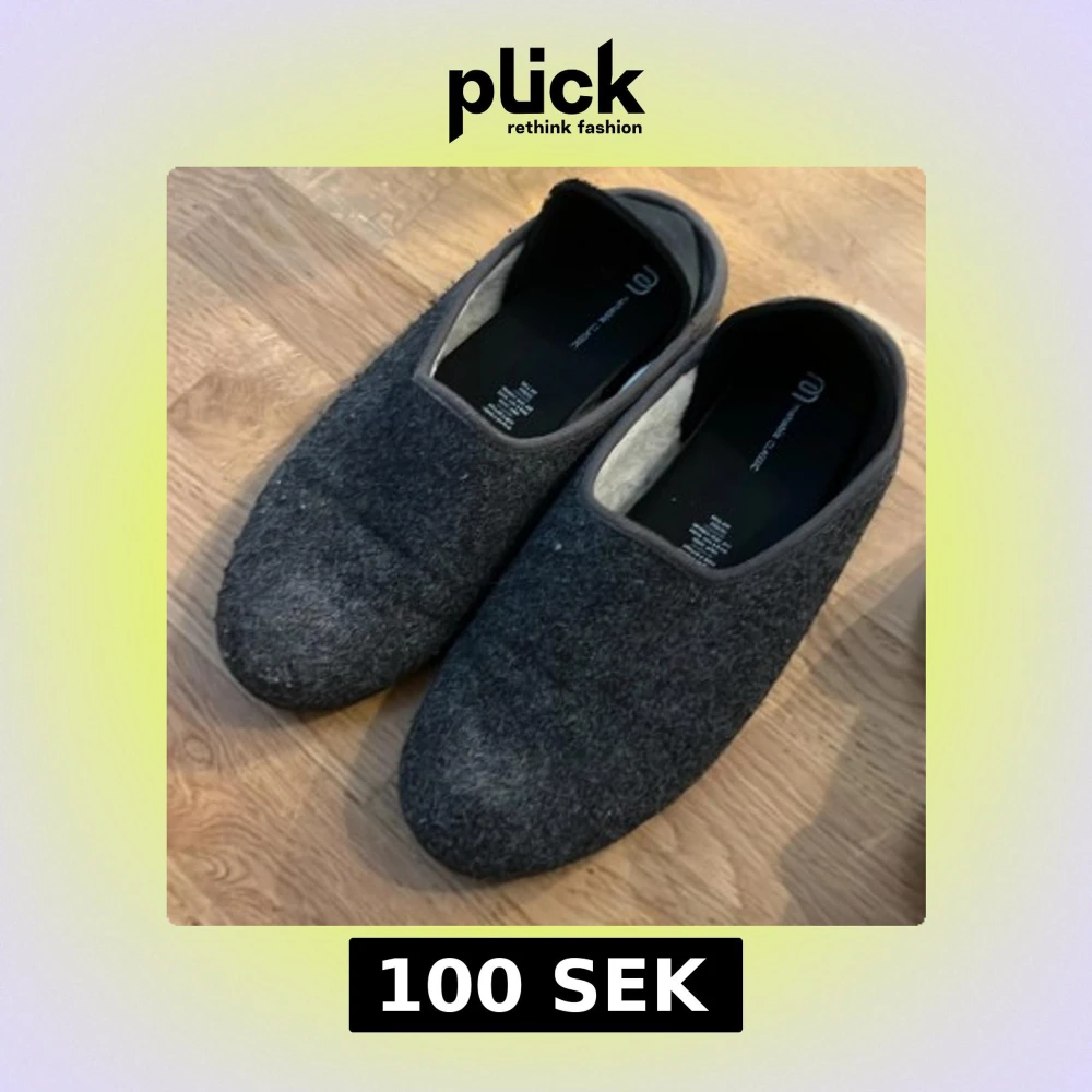 Mörkgråa tofflor i textilmaterial med svart sula. De har en enkel och klassisk design med rund tå och mjuk insida, perfekta för att glida runt hemma. Tillverkade i Portugal och designade i London.