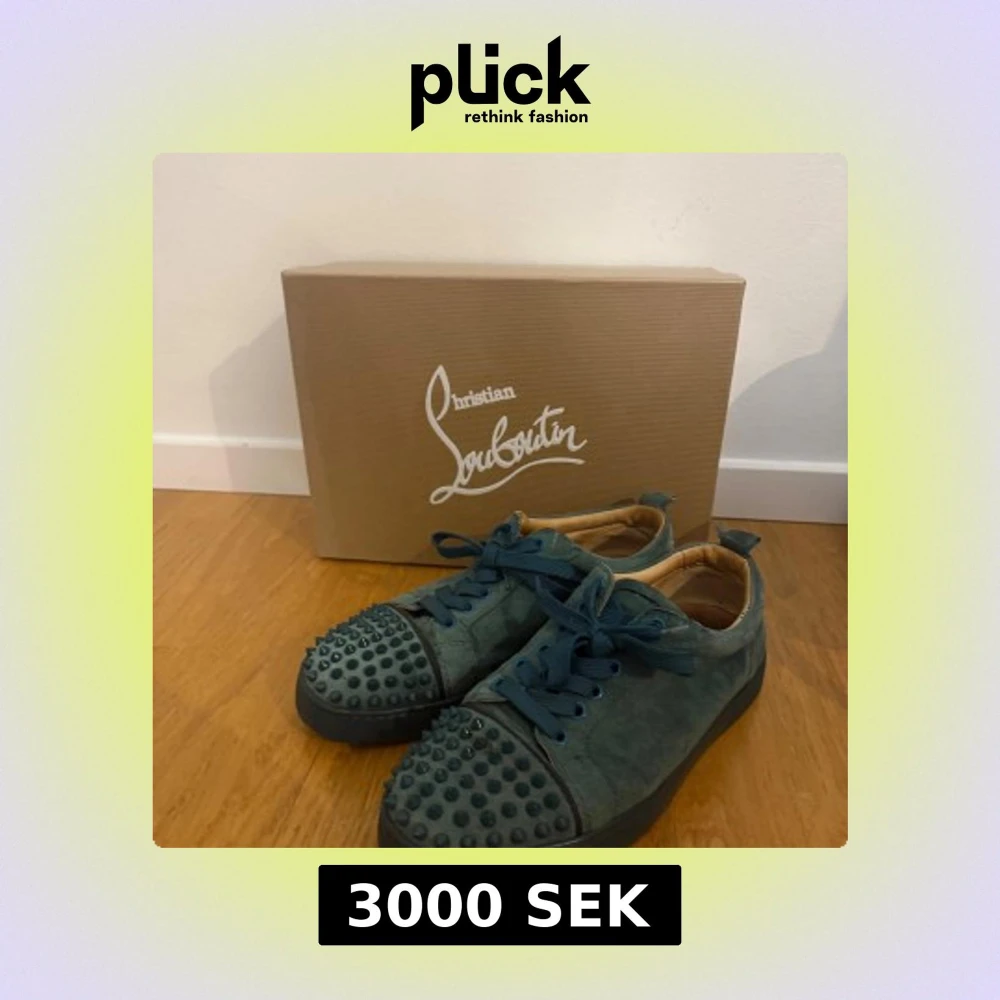 Unika mörkgröna sneakers från Christian Louboutin i mocka med coola nitar på tån och klassisk röd sula. Skorna har snörning och rund tå, samt exklusiva detaljer som sticker ut. Perfekta för dig som vill ha något extra och vågar sticka ut. Passar storlek 40 till 41,5
