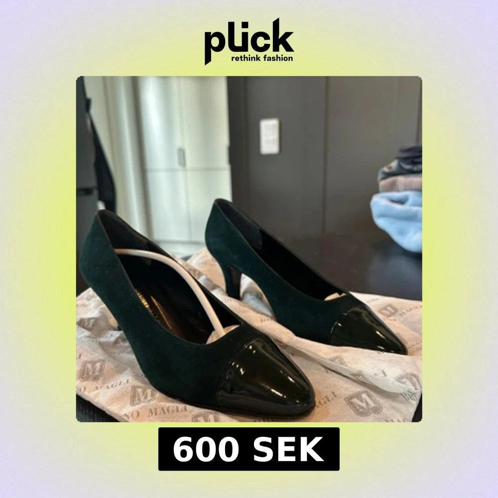 Snygga mörkgröna pumps med klack och lackad spetsig tå. Skorna har en elegant form och är tillverkade i mocka med detaljer i lack. Perfekta för dig som vill ha en klassisk och stilren sko med det lilla extra. Skulle att det är en stor i storleken, passar strl. 38💚