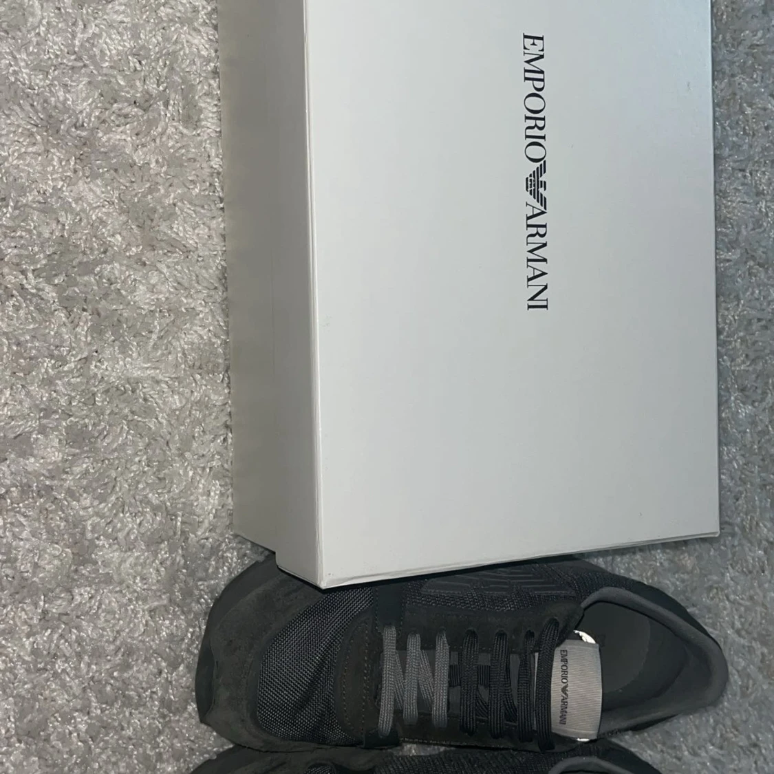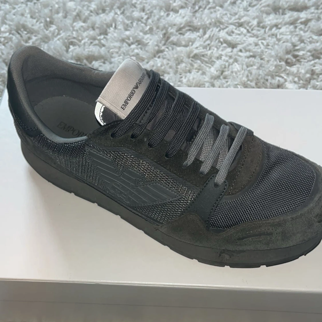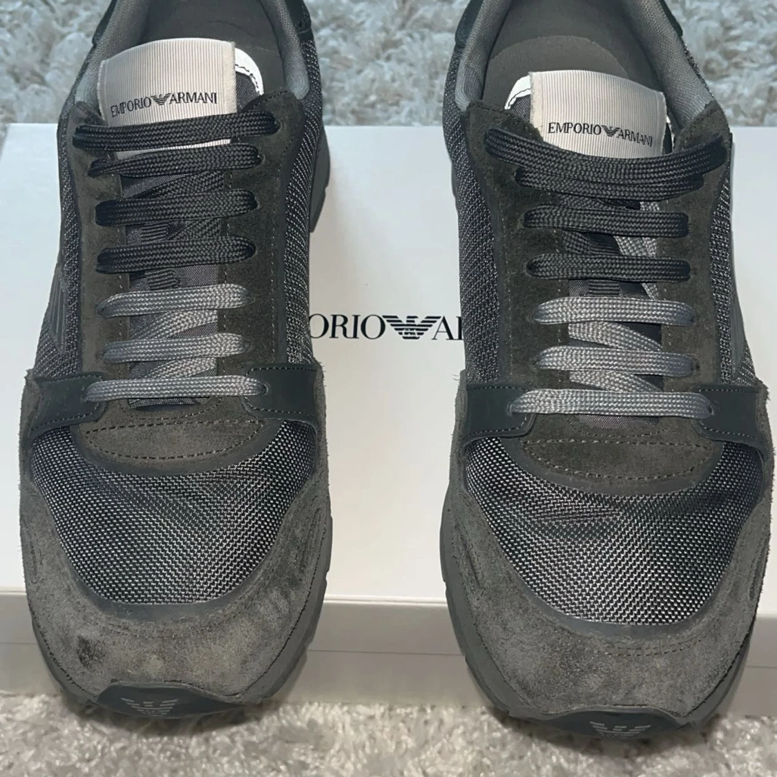 Snygga svarta sneakers från Emporio Armani med grå detaljer. Skorna har en mix av mocka och mesh, samt klassisk snörning. Ikoniska Armani-loggan syns på sidan och tungan. Perfekta för dig som gillar stilrena och exklusiva sneakers.