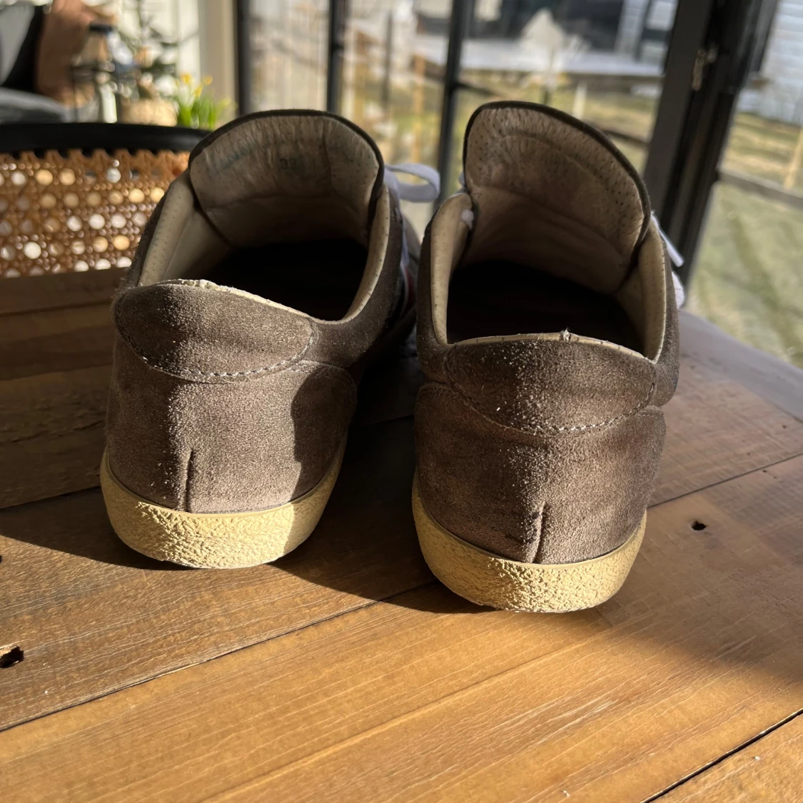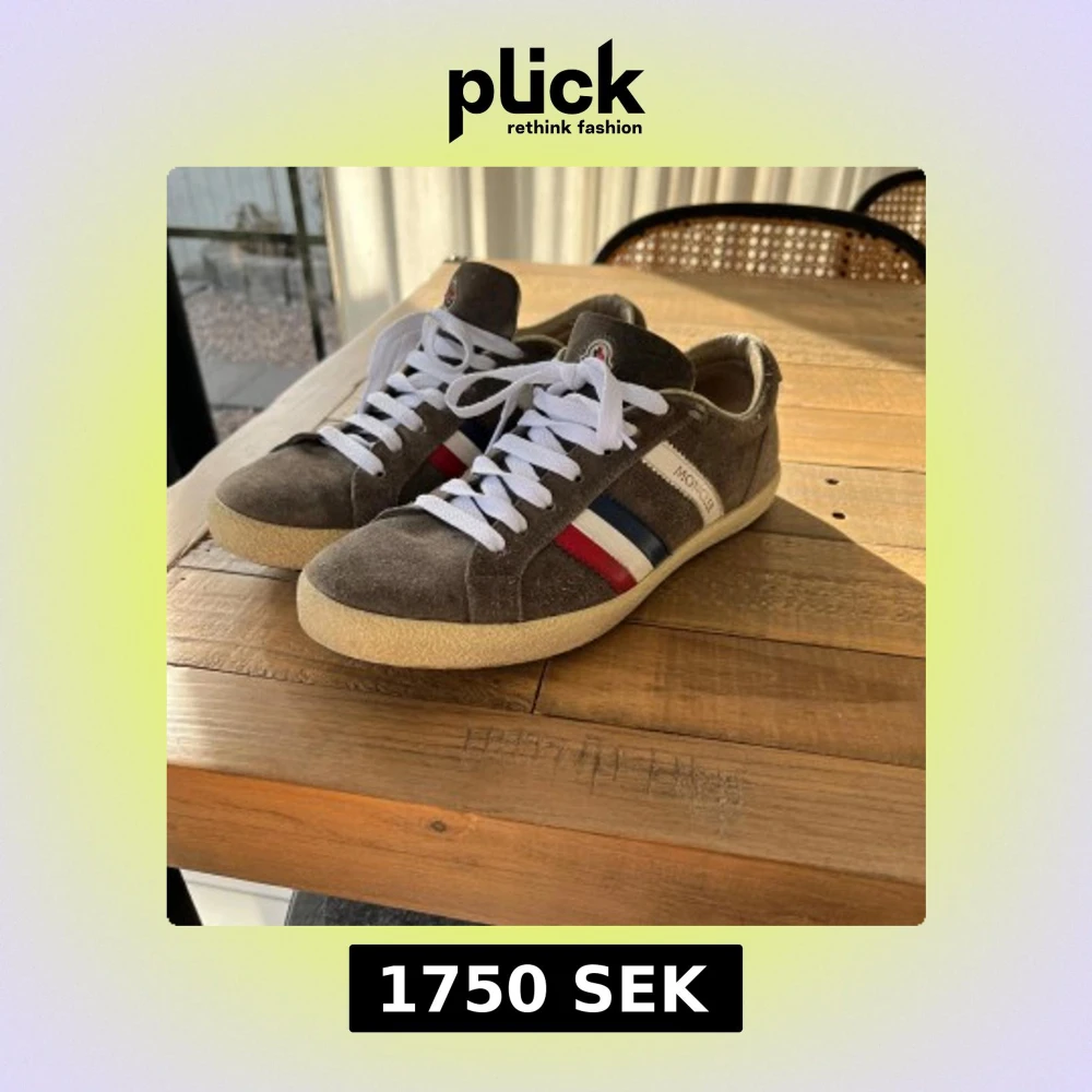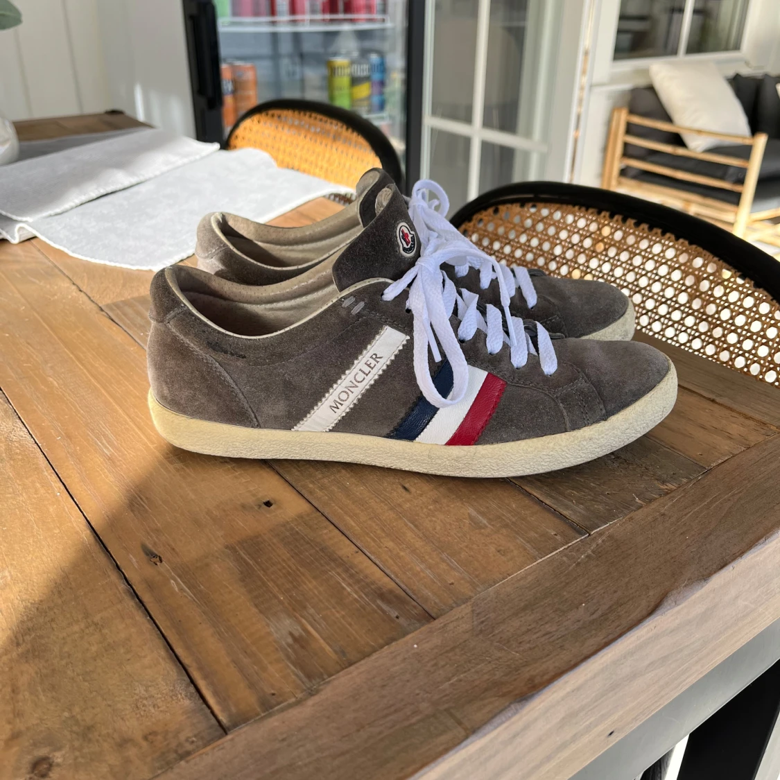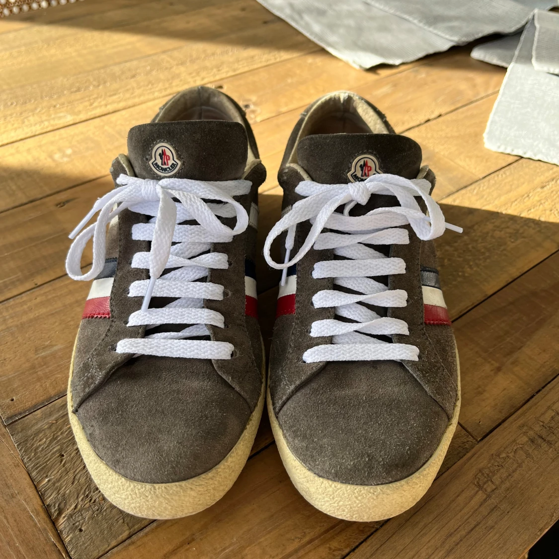 Snygga mörkgröna sneakers från Moncler i mocka med vita snören. Skorna har Monclers ikoniska ränder i rött, vitt och blått på sidan. Är i storlek 39 men sitter något större