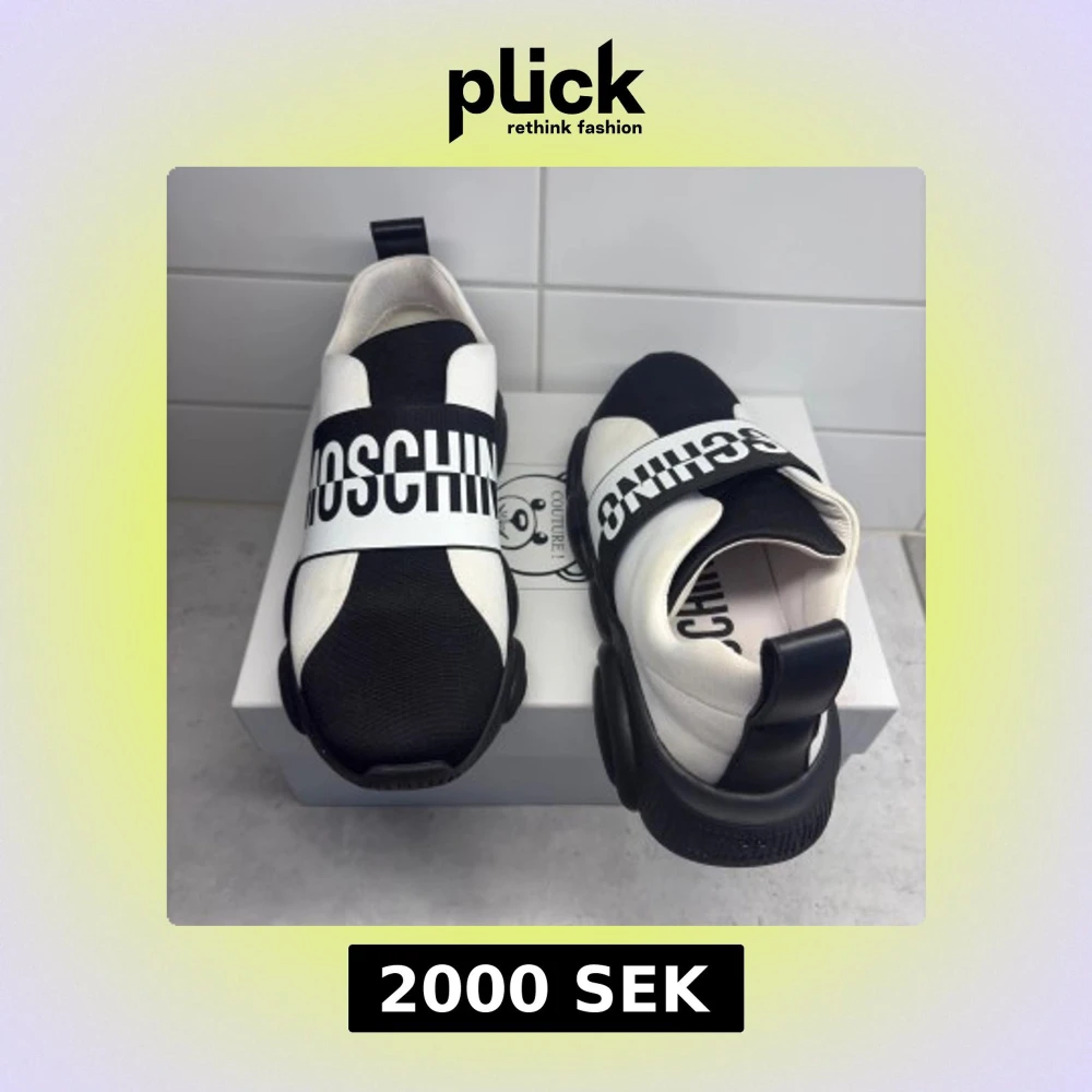 Säljer ett par Moschino sneakers i svart och vitt med bred logorem över foten. Sulan har en unik design med nallemotiv och texten 'This is not a Moschino toy'. Ovandelen är i textil och syntet, med rund tå och platt sula. Perfekt för dig som gillar statement pieces. Använda sparsamt fåtal gånger. Säljs inte i dessa färger längre och är slutsålda. Intresse koll.
