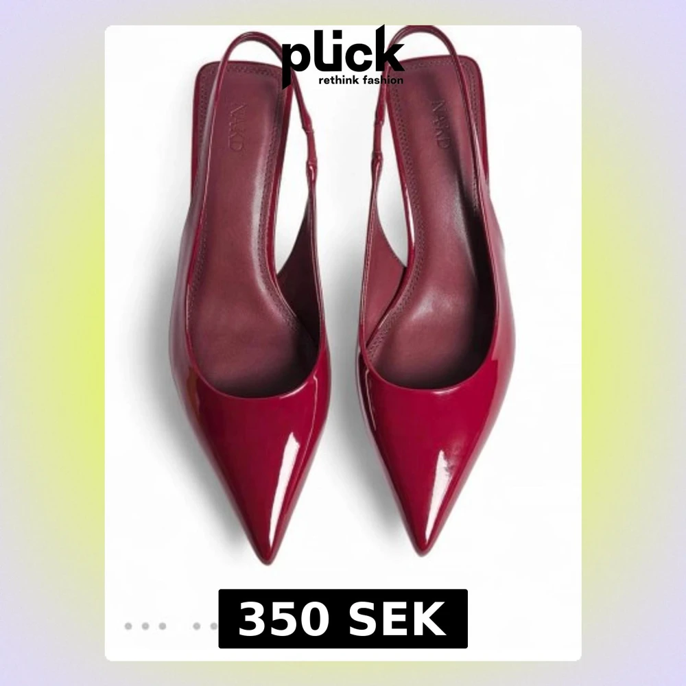 Säljer ett par eleganta vinröda pumps från NAKD med spetsig tå och slingback-rem. Skorna har en låg klack och är tillverkade i glansigt syntetmaterial som ger en lyxig känsla. Perfekt för dig som gillar stilrena och trendiga skor med lite extra edge.