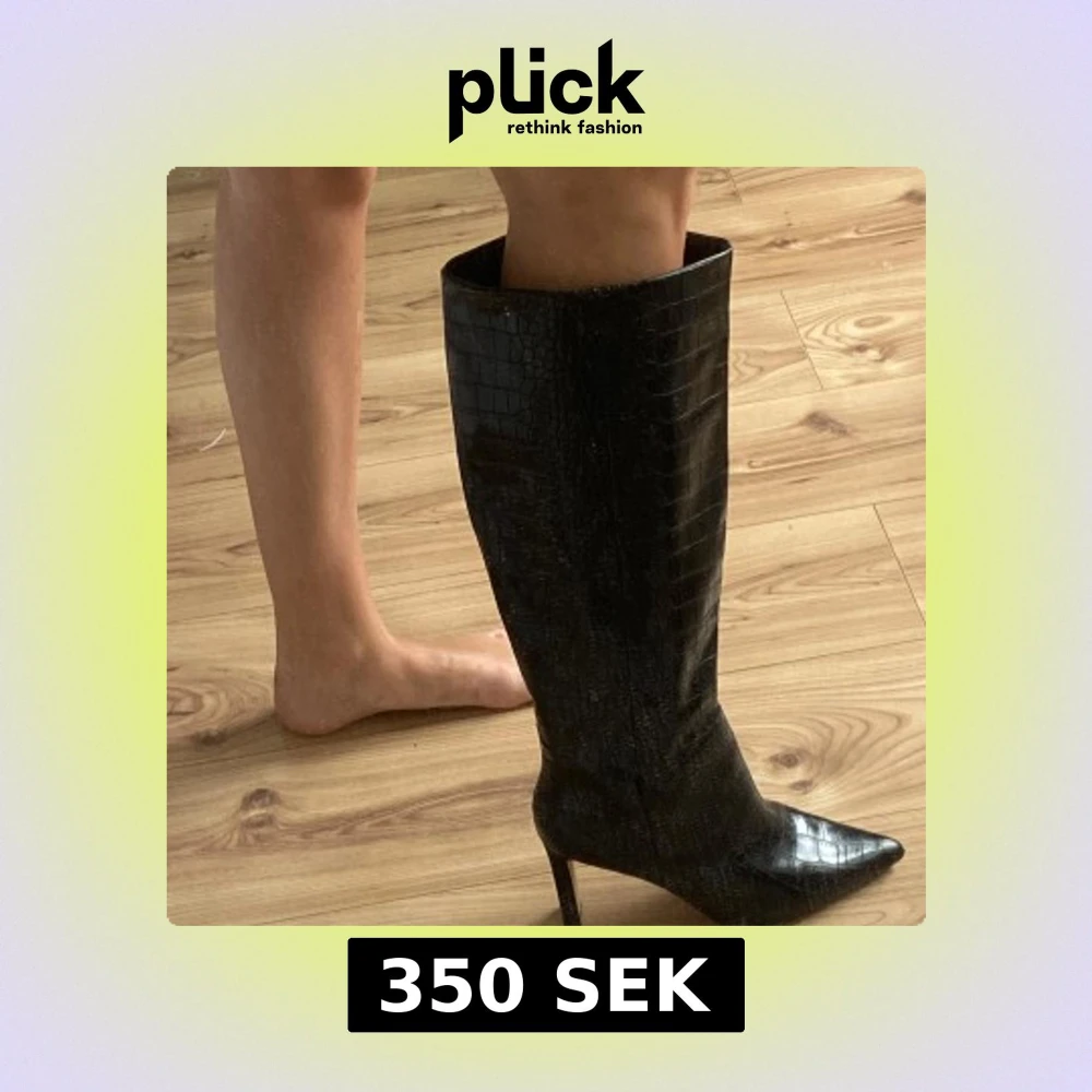 Säljer ett par svarta höga boots med spetsig tå och hög klack. Skorna har ett snyggt krokopräglat mönster och är tillverkade i glansigt syntetmaterial som ger en lyxig känsla. Perfekta för att lyfta vilken outfit som helst.