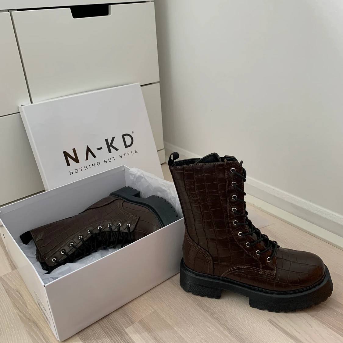 Hej! Säljer dessa helt nya bootsen från NA-KD! Har aldrig använt de endast testade, köpta för 499kr men säljer för endast 299kr då redan har ett liknade par. Storlek 39 passar även 40! Skriv för fler bilder , frakten är såklart spårbar 🥰