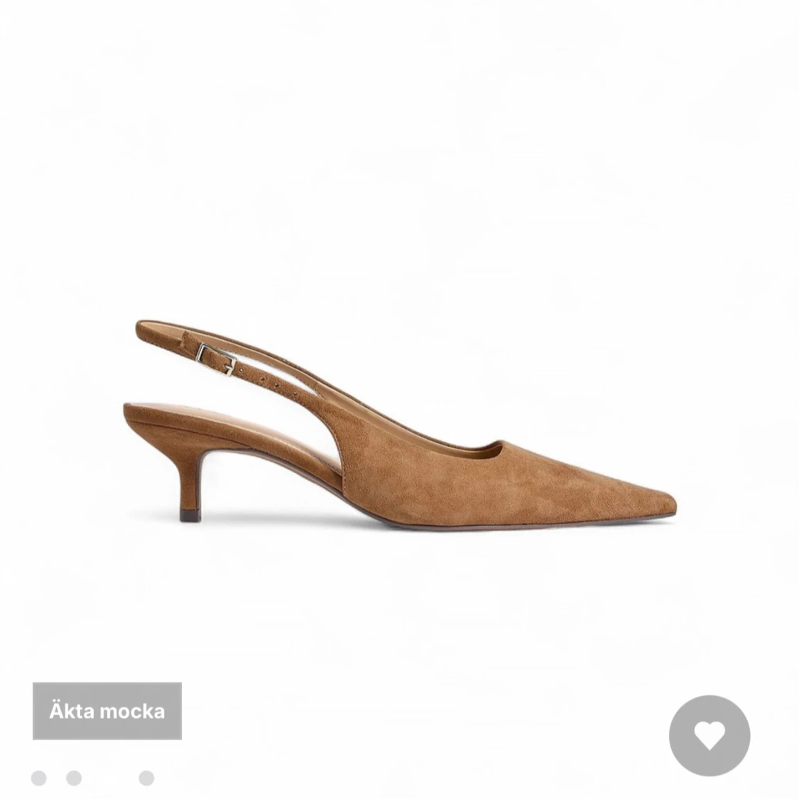 Snygga pumps i äkta mocka med spetsig tå och låg klack. Skon har en öppen häl med justerbart spänne. Säljer då jag ej hann lämna tillbaka dem, aldrig använda. Nypris 799.