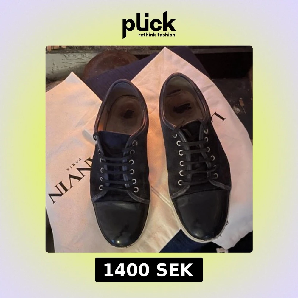 Snygga svarta sneakers från Lanvin med snörning och en stilren design. Skorna har en kombination av mocka och skinn, vilket ger dem en unik look. Skicket är 7/10. Defekter är på toeboxen och insidan av skon, (går nog att reperara) Storleken är UK 9 vilket motsvarar 43-44 men de sitter stort i storleken. Tillbehör är 2 dustbags, ingen orginal box tyvärr.