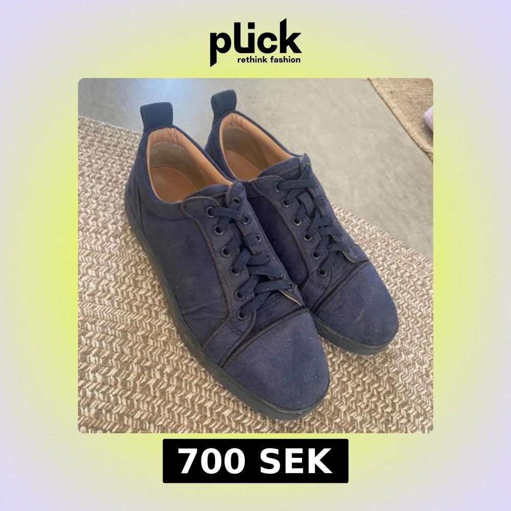 Snygga mörkblå sneakers från Christian Louboutin med klassisk röd sula och diskret logga undertill. Skorna har rund tå, snörning och är tillverkade i canvas med detaljer i skinn. Perfekta för dig som vill ha en stilren men ändå lyxig look.