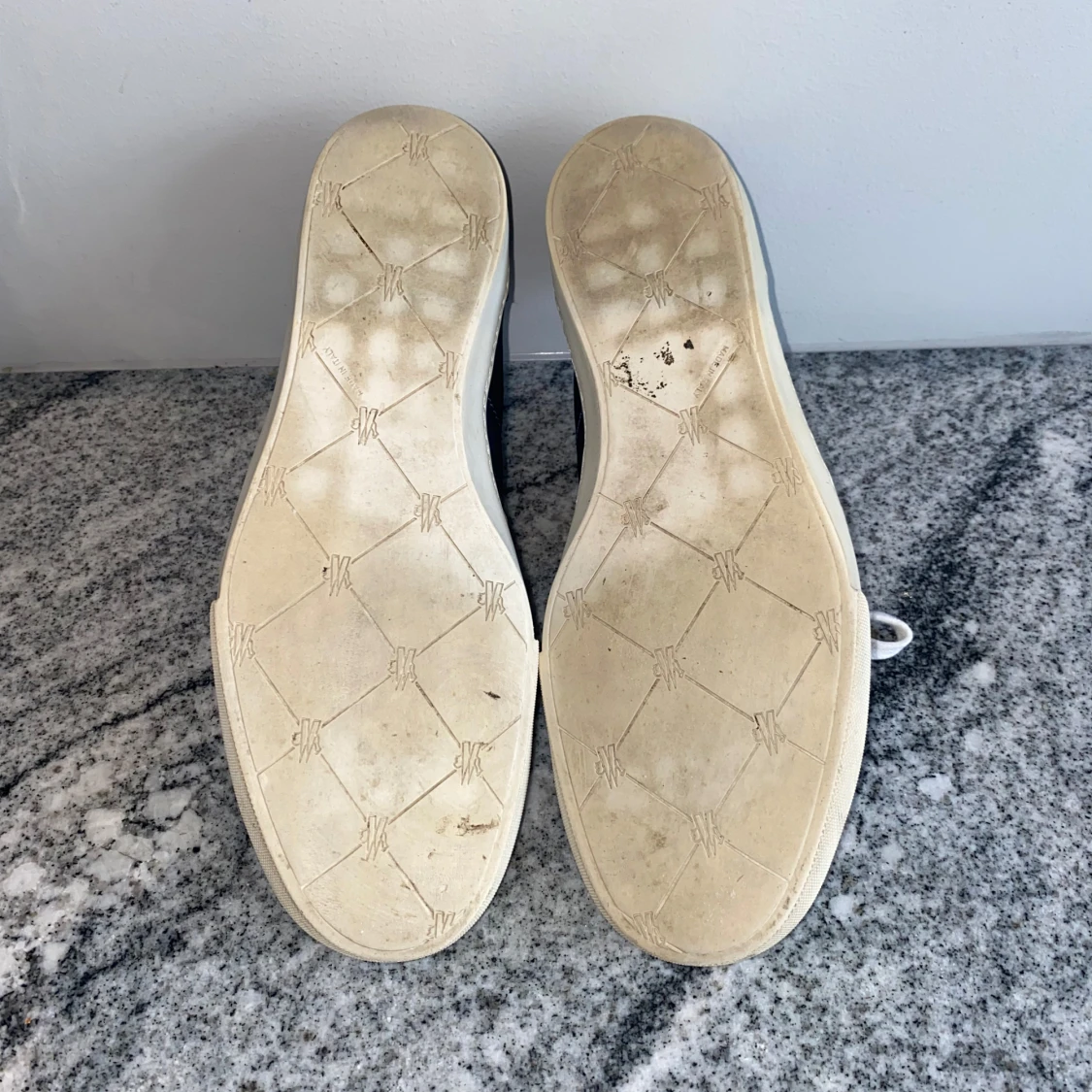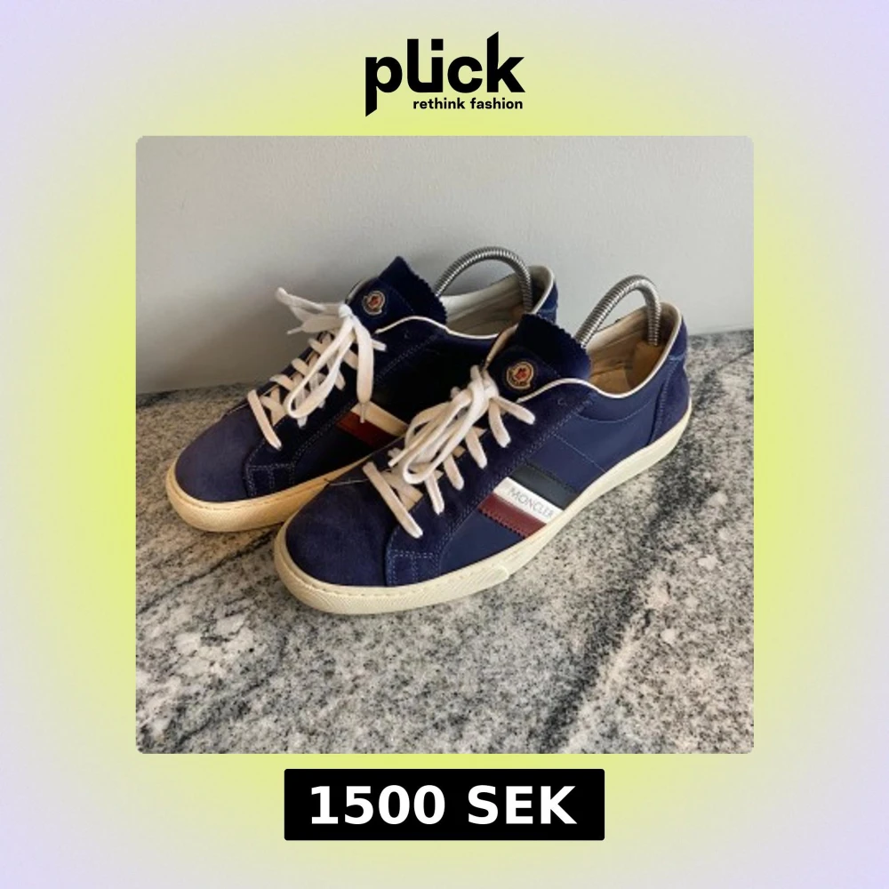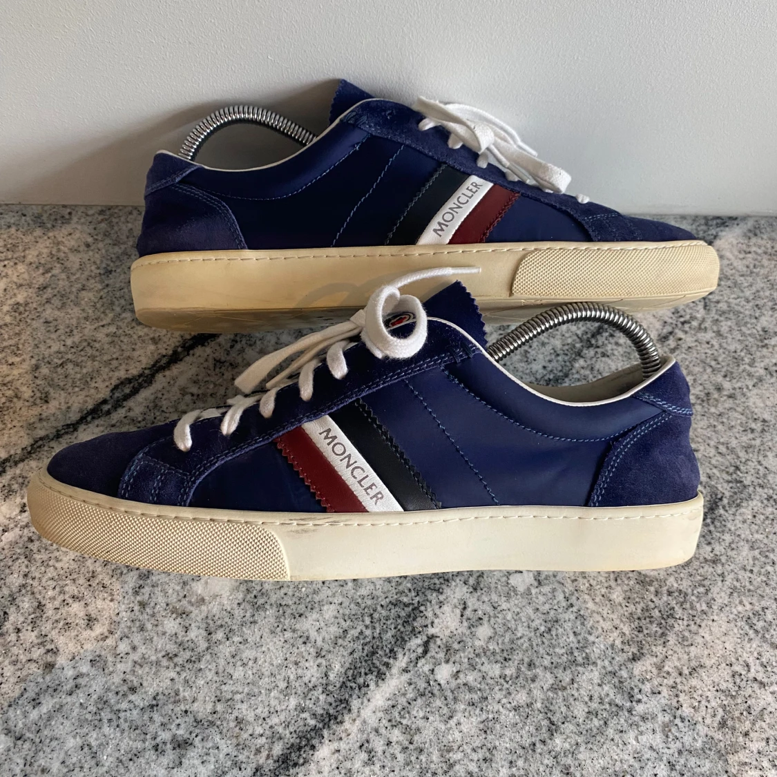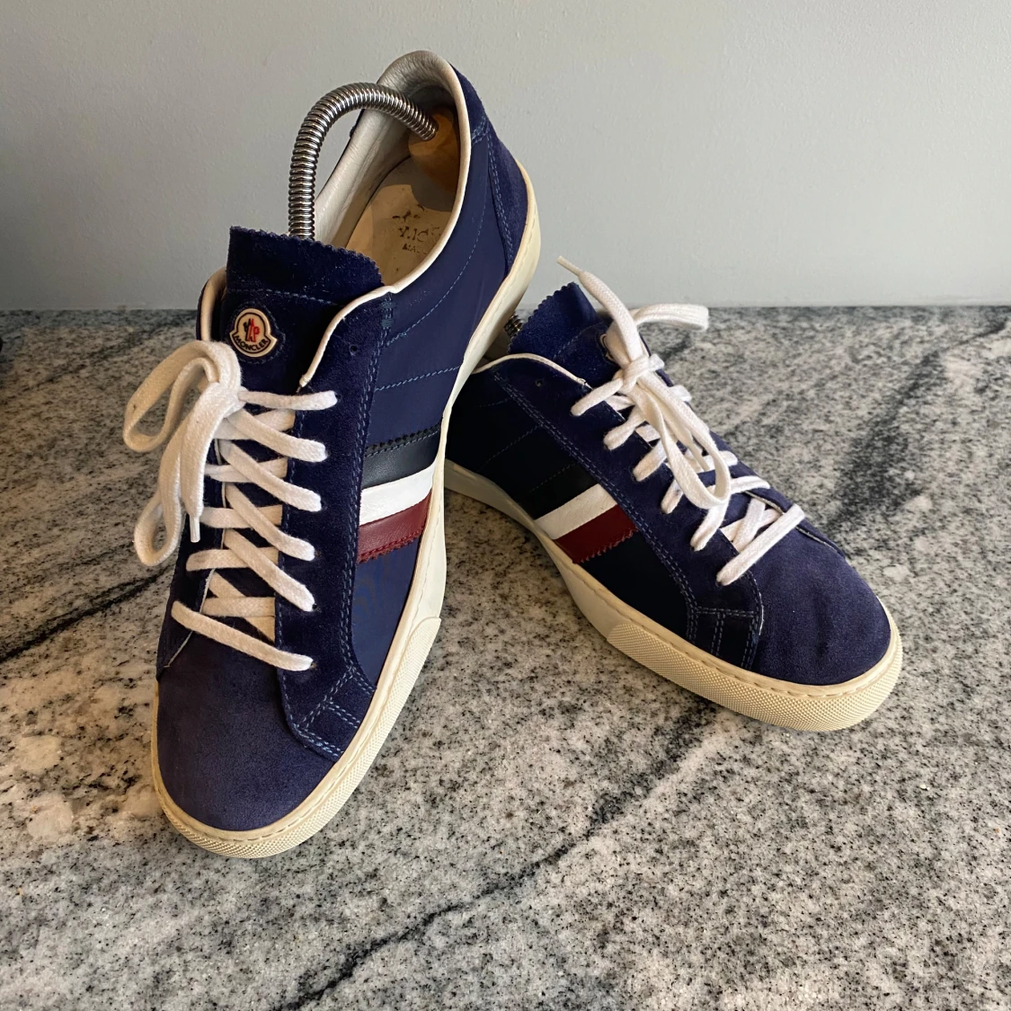 Snygga blå sneakers från Moncler med vita snören och röd-vit-blå rand på sidan. Skorna har rund tå, platt sula och Moncler-logga på plösen. Materialmix av mocka och skinn ger en exklusiv känsla. Med mocka där fram och bak. Pris kan diskuteras.