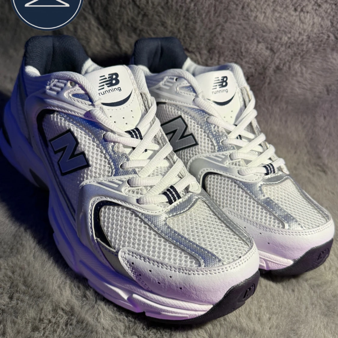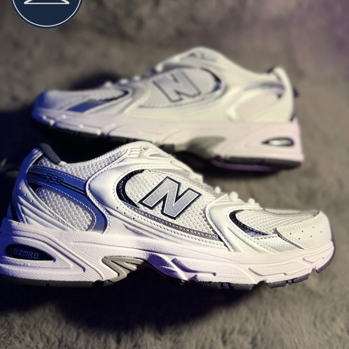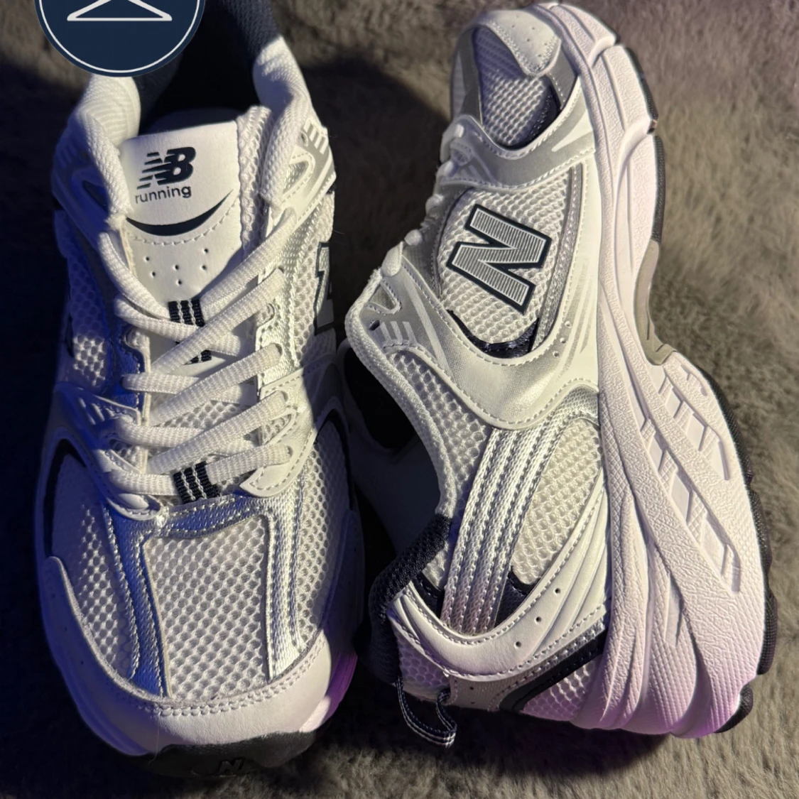 Säljer ett par New Balance 530 sneakers i vitt med silvriga och svarta detaljer. Skorna har meshpaneler för extra andningsförmåga, klassisk snörning och en chunky sula med svart yttersula. Perfekta för dig som gillar retrovibbar och sportig stil. Priset är ej hugget i stenen ännu✅ Skriv gärna vid minsta lilla funderingar