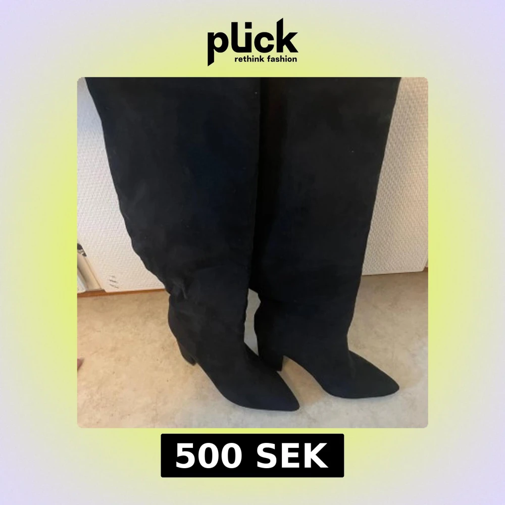 Snygga svarta stövlar i mocka med spetsig tå och bred klack. Från Nelly i storlek 37 nypris ca 800 endast använda 1 gång. Slutsålda, eller säljs inte längre. Sista bilden är från nellys hemsida när dem fanns inne.