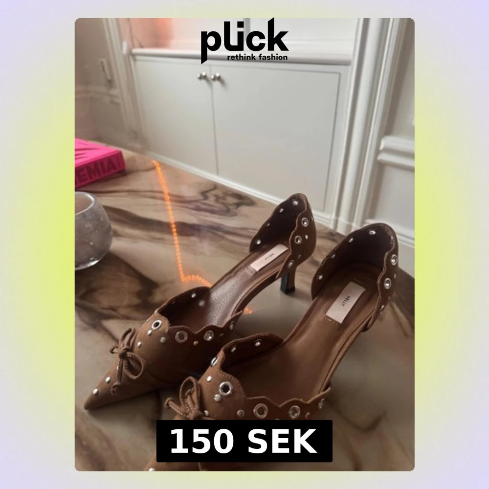 Snygga bruna klackar från Nelly i mockaimitation med spetsig tå, låg klack och coola silverfärgade detaljer. Skorna har vågig kant och en söt rosett framtill som ger en unik touch. Perfekta för dig som vill sticka ut med detaljer och stil!!!!❤️❤️ skorna är oanvända då dom är fel storlek!