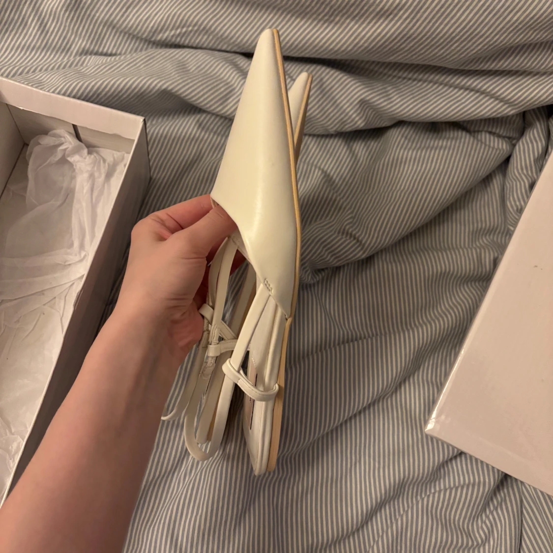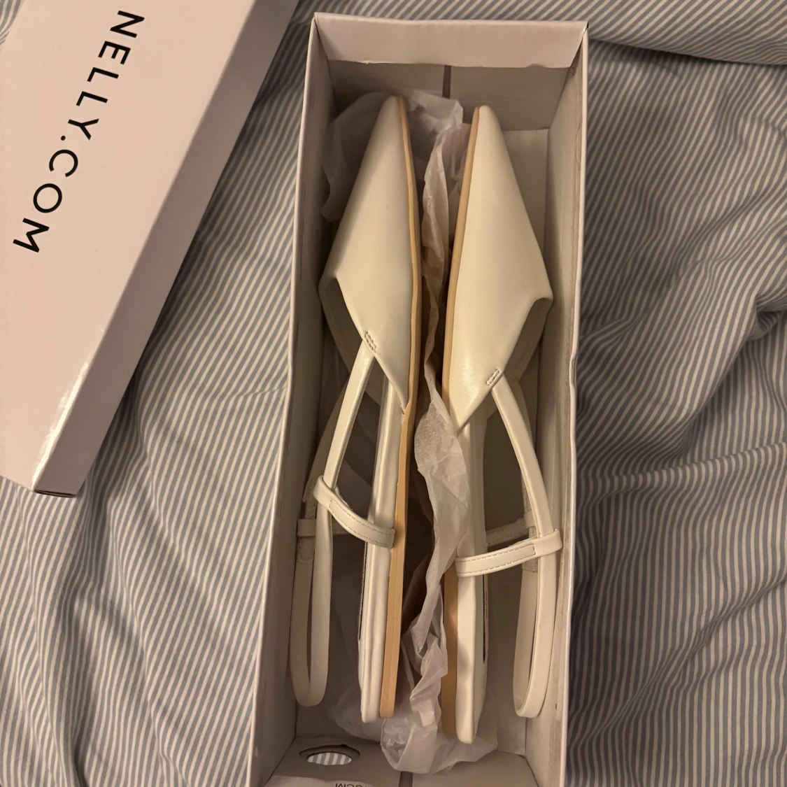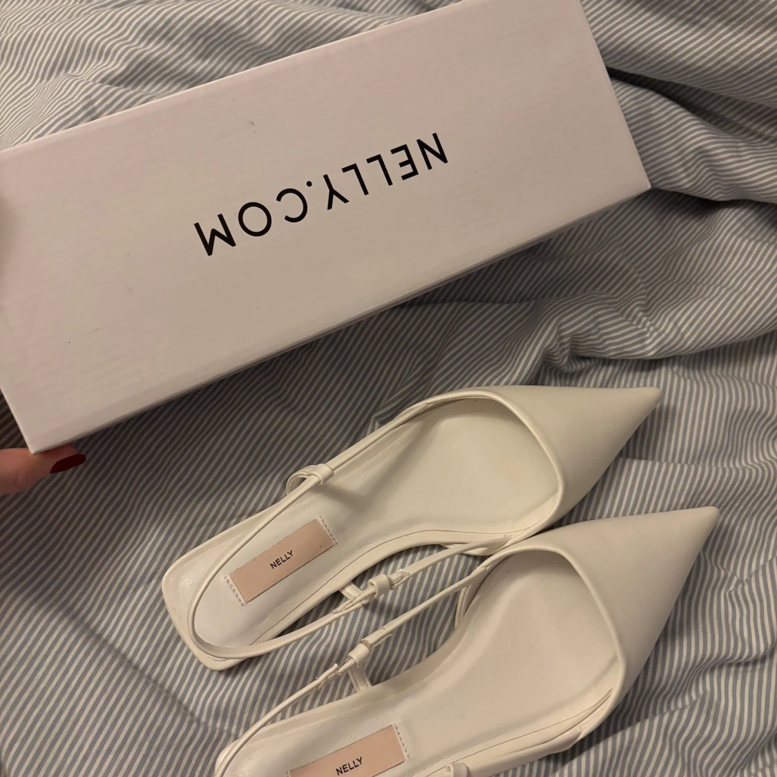 Säljer ett par stilrena vita pumps från Nelly med spetsig tå och smala remmar runt hälen. Skorna har platt sula och är perfekta för dig som gillar minimalistisk och trendig design. HELT NYA, förpackning tillkommer!