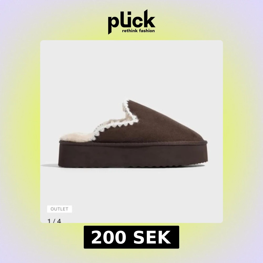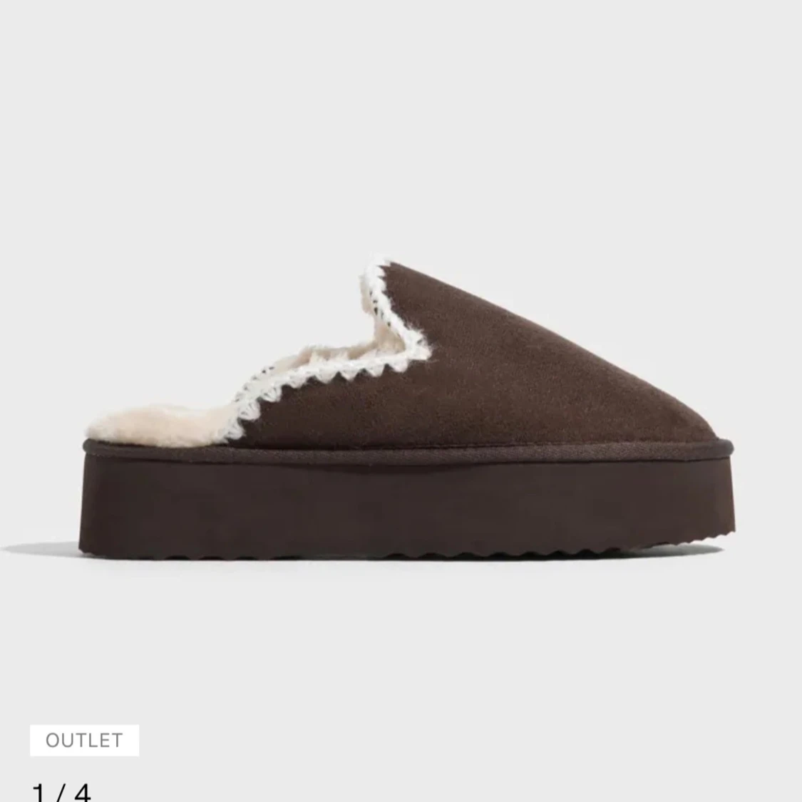 Mysiga bruna tofflor i mocka med vit pälsfodring och hög platåsula. Perfekta för kalla dagar när du vill ha det extra bekvämt ute. Snygg kontrast mellan det bruna och den vita kanten.