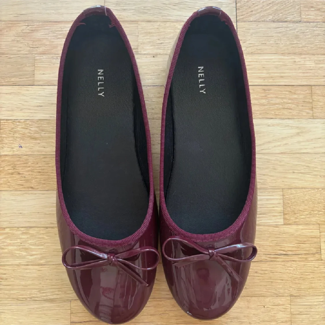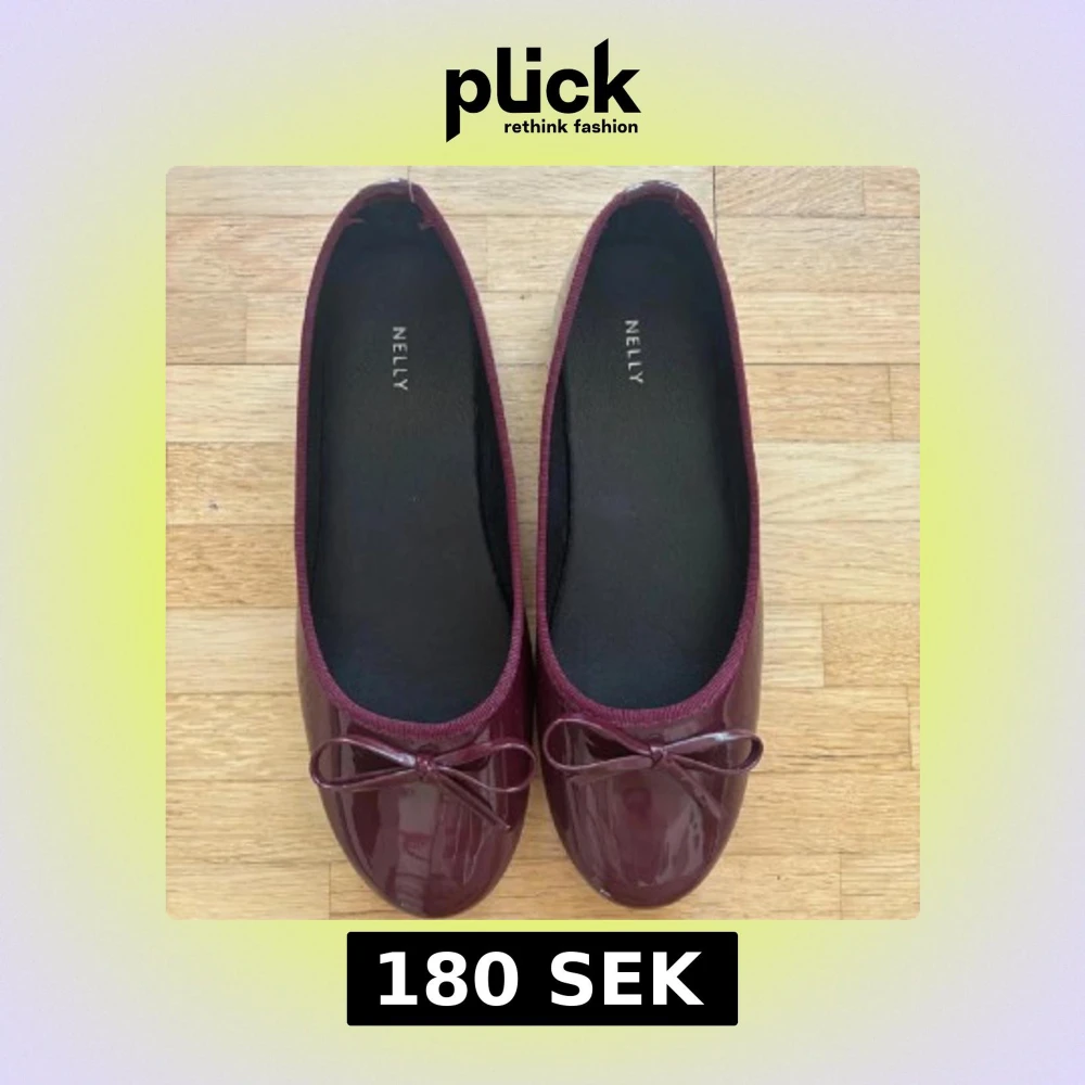 Snygga vinröda ballerinaskor från Nelly med lackad finish och söt rosettdetalj framtill. Skorna har rund tå och platt sula, perfekta för en stilren och trendig look. Endast testade