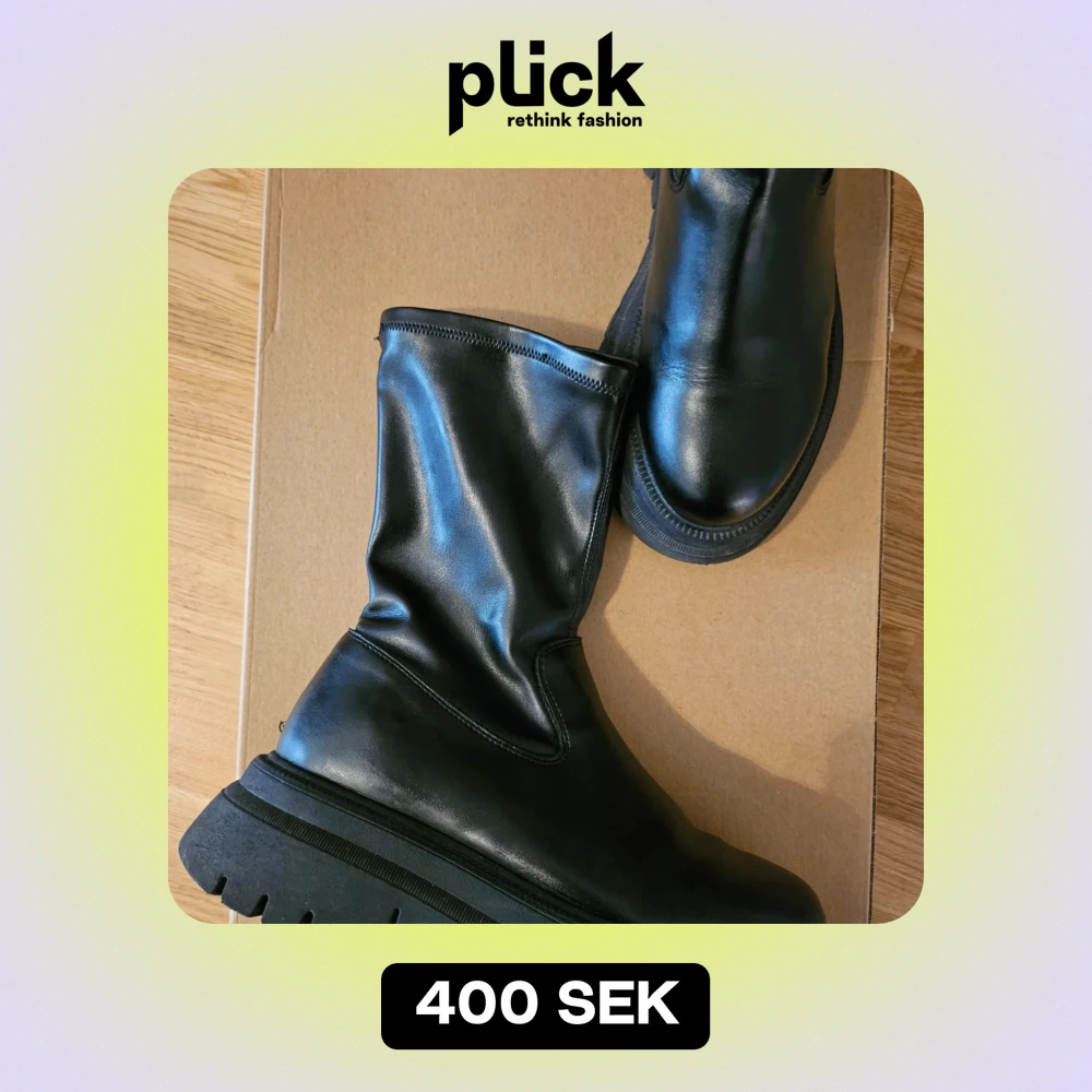Snygga svarta stövlar med en robust sula. Perfekta för höst och vinter, dessa boots har en stilren design utan snörning eller dragkedja. De är i mycket bra skick, finns få defekter.
