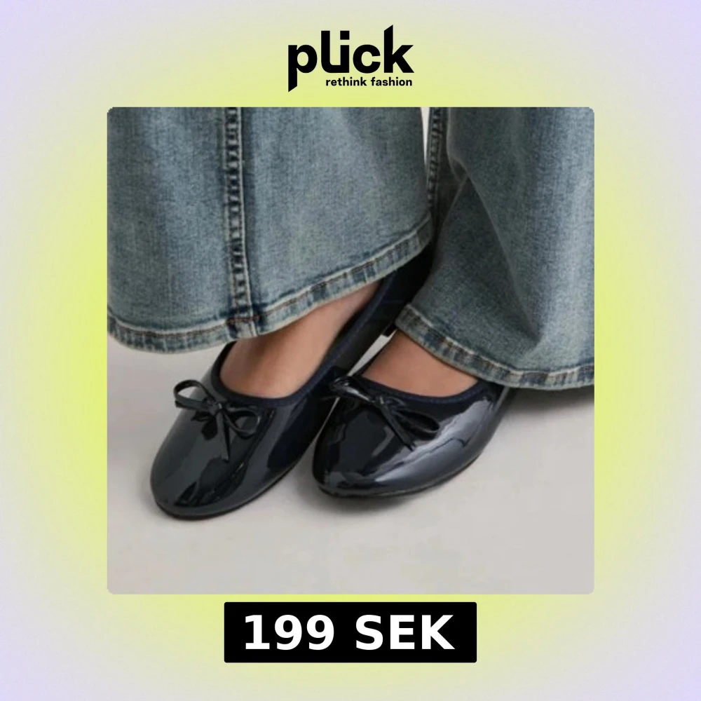 Glansiga mörkblå ballerinaskor från Nelly med rund tå och söt rosettdetalj framtill. Skorna har platt sula och är tillverkade i syntetmaterial med lackad finish. Perfekta för en stilren och trendig look.