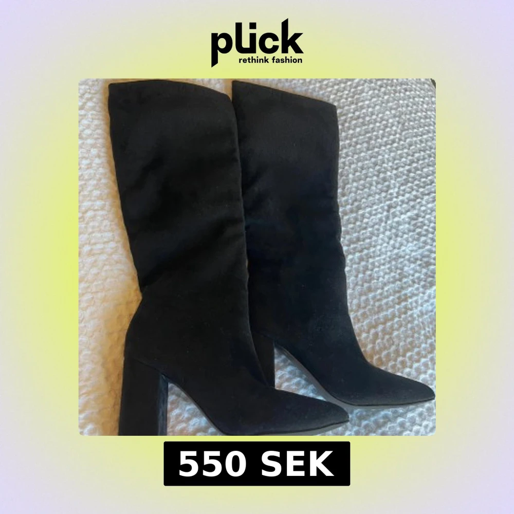 Säljer ett par svarta höga stövlar i mocka-look med spetsig tå och klack. Passar perfekt till både jeans och kjol. Stövlarna har en stilren design och är riktigt trendiga just nu. Skick: Endast testade inomhus, inga märken eller defekter! Märke: Nelly Färg: Svart Info: Säljs ej längre i butik! Pris:550 kr Perfekt skick, endast testade inomhus. Kontakta mig för mer info eller bilder! ✨