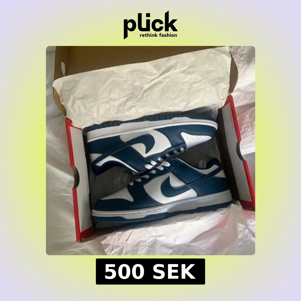 Säljer ett par Nike Dunk Low sneakers i blått och vitt med klassisk swoosh på sidorna och röd Nike-logga bak. Skorna har platt sula och rund tå, perfekta för dig som gillar streetwear och snygg design.