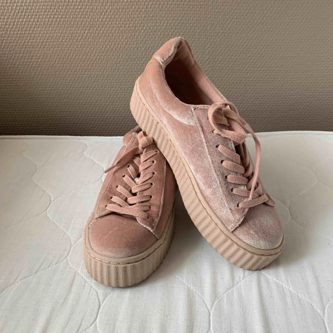 Rosa platåsko i sammet. Ljusrosa i storlek 38, från Nly shoes. Använda endast en gång. Köparen betalar frakt.