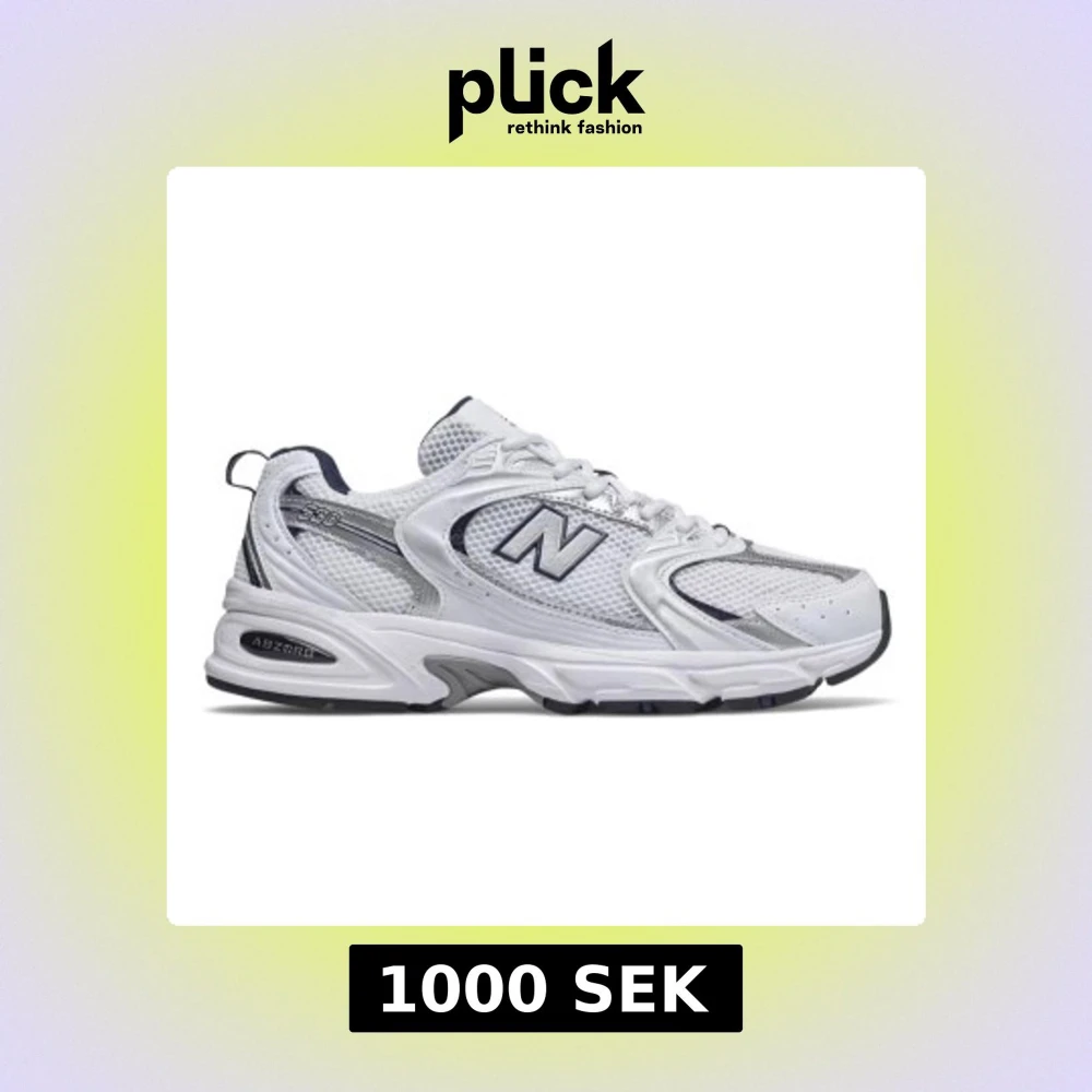 Säljer ett par New Balance 530 sneakers i vit och silver med mesh och syntetmaterial. Skorna har en chunky sula med ABZORB-dämpning, snörning och klassisk New Balance-logga på sidan. Perfekt för dig som gillar retrostil och sportig vibe.
