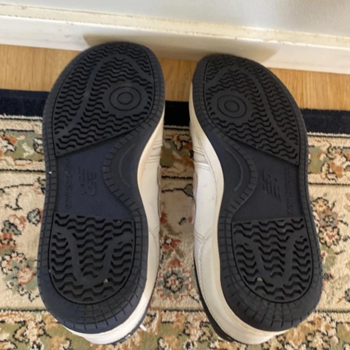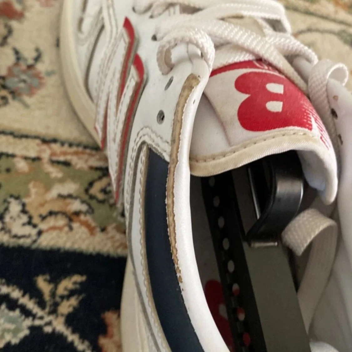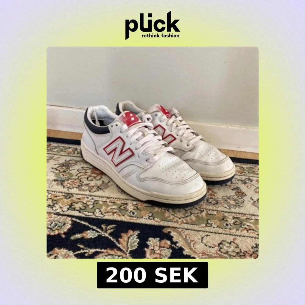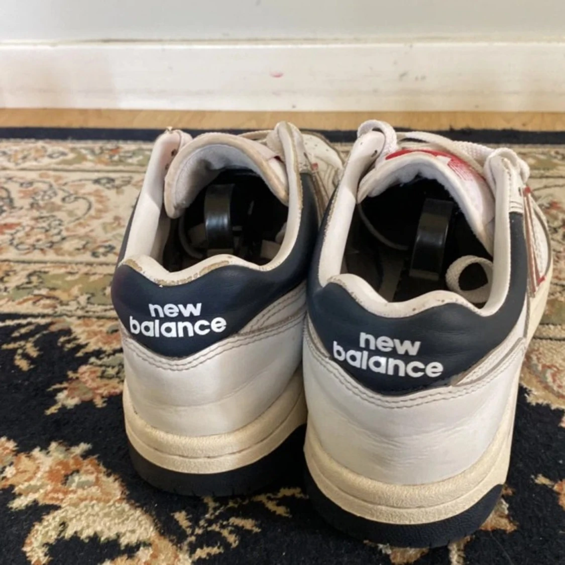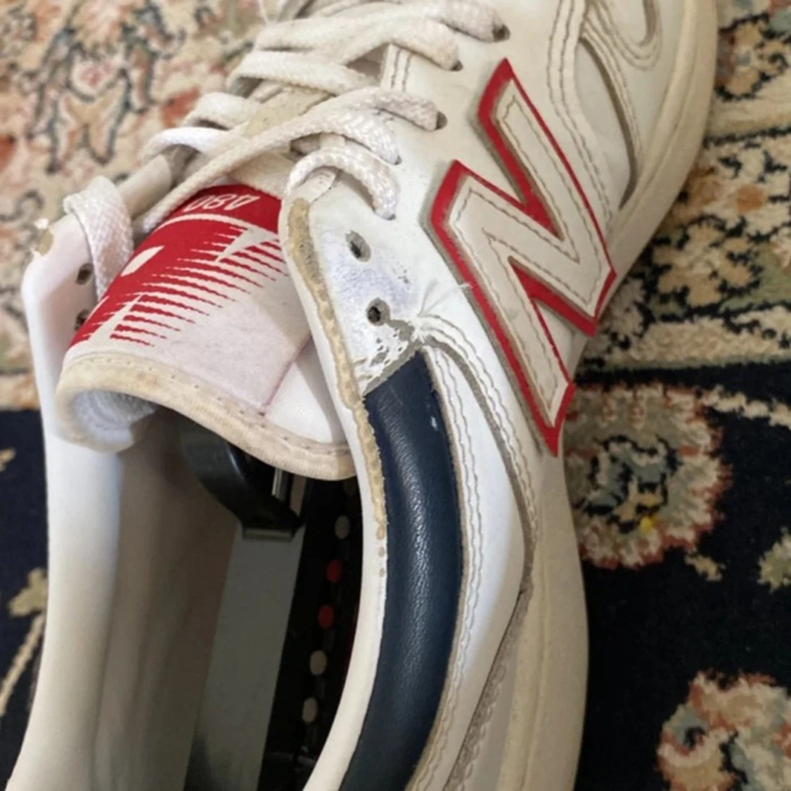 Säljer ett par vita New Balance sneakers med röda och blå detaljer. Skorna har snörning och en bekväm sula, perfekt för vardagsbruk. Den klassiska New Balance-loggan syns tydligt på sidan.