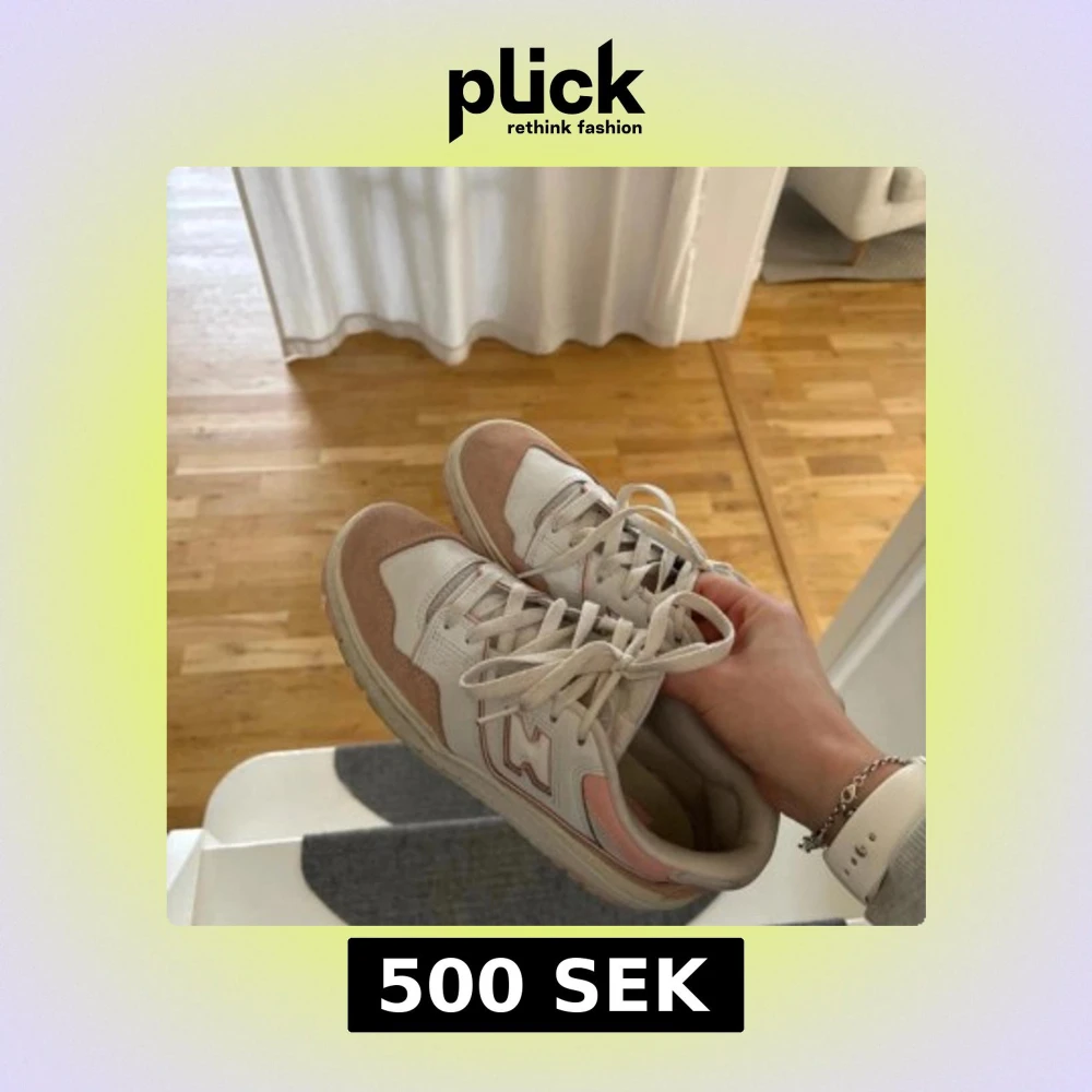Säljer ett par New Balance 550 sneakers i vitt och ljusrosa med snygga detaljer. Skorna har snörning, platt sula och är tillverkade i en mix av skinn och mocka. Perfekta för dig som vill ha en fräsch och sportig look med en touch av pastell.