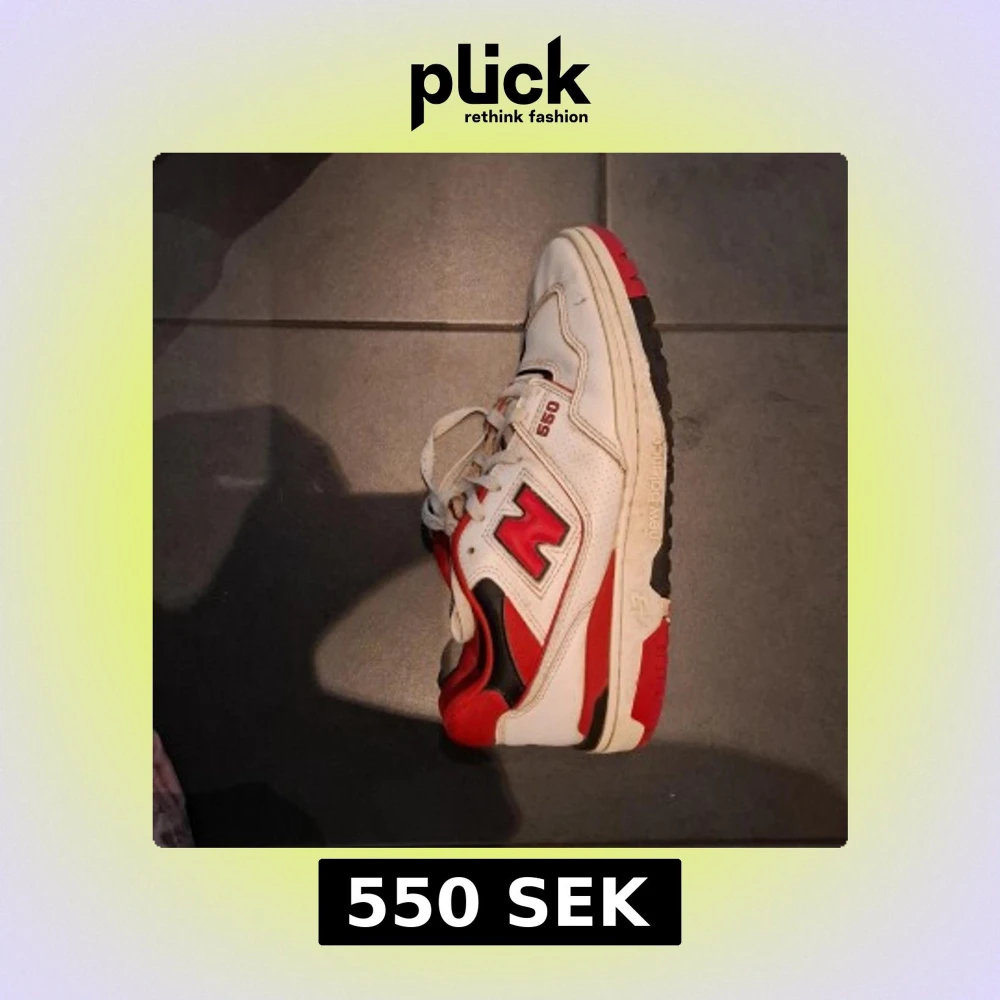 Säljer ett par New Balance 550 sneakers i vitt, rött och svart. Skorna har klassisk retrodesign med perforerade paneler, snörning och tydlig New Balance-logga på sidan. Ovandelen är i skinn och textil, sulan är robust och har bra grepp.
