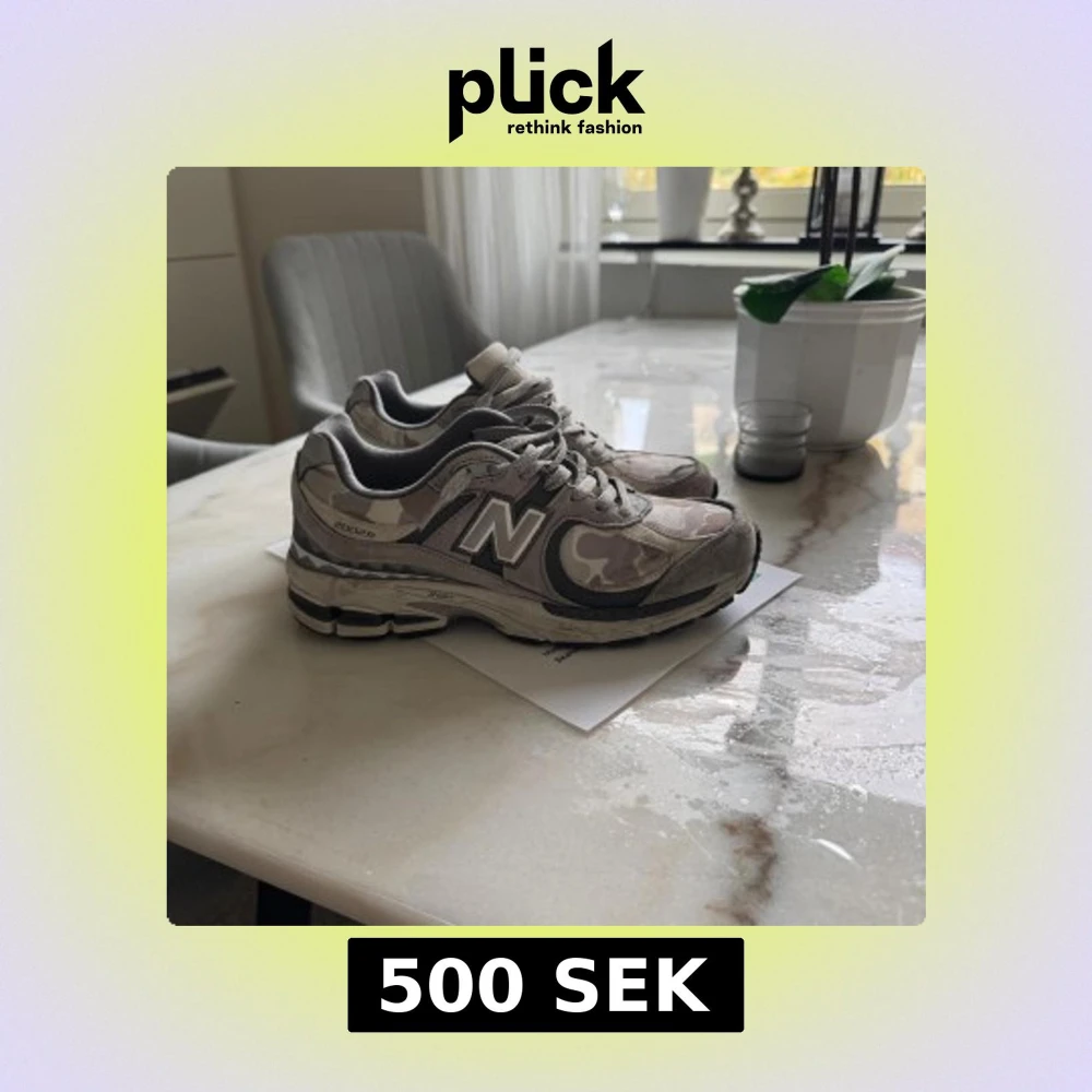 Säljer ett par New Balance 2002R sneakers i grått och beige camo-mönster. Skorna har klassisk N-logga på sidan, snörning och en chunky sula med coola detaljer. Ovandelen är i en mix av mocka och syntetmaterial. Perfekta för dig som gillar streetwear och vill sticka ut.