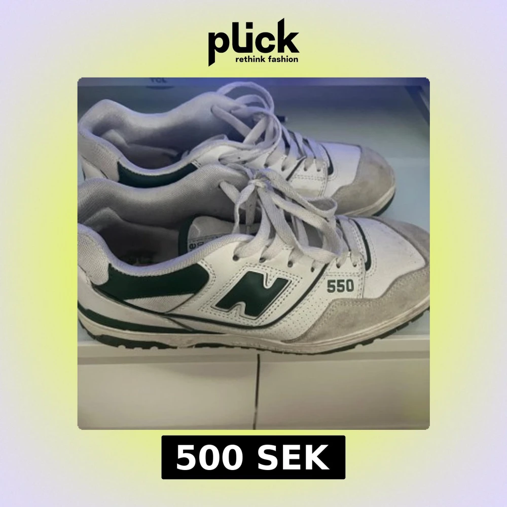 Säljer ett par New Balance 550 sneakers i vit och mörkgrön färg med klassisk N-logga på sidan. Replika. Skorna har snörning, platt sula och rund tå. Materialet är en mix av skinn och syntet med detaljer i mocka. Perfekt för dig som gillar retrostil och sportig vibe.