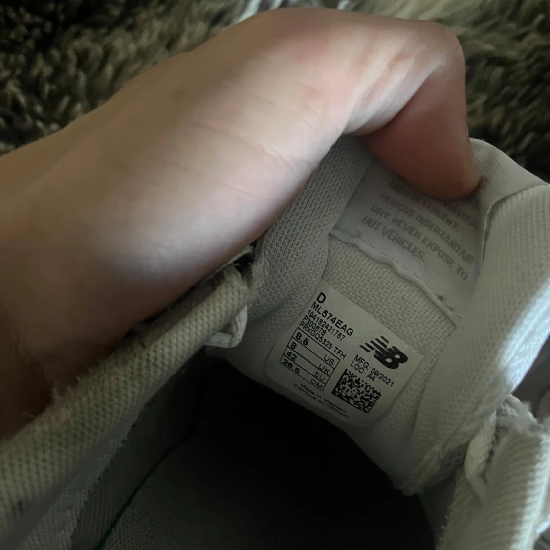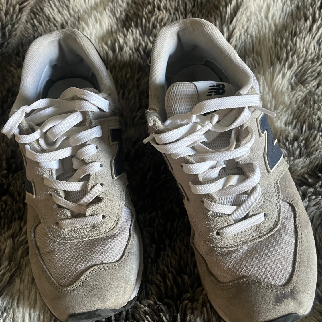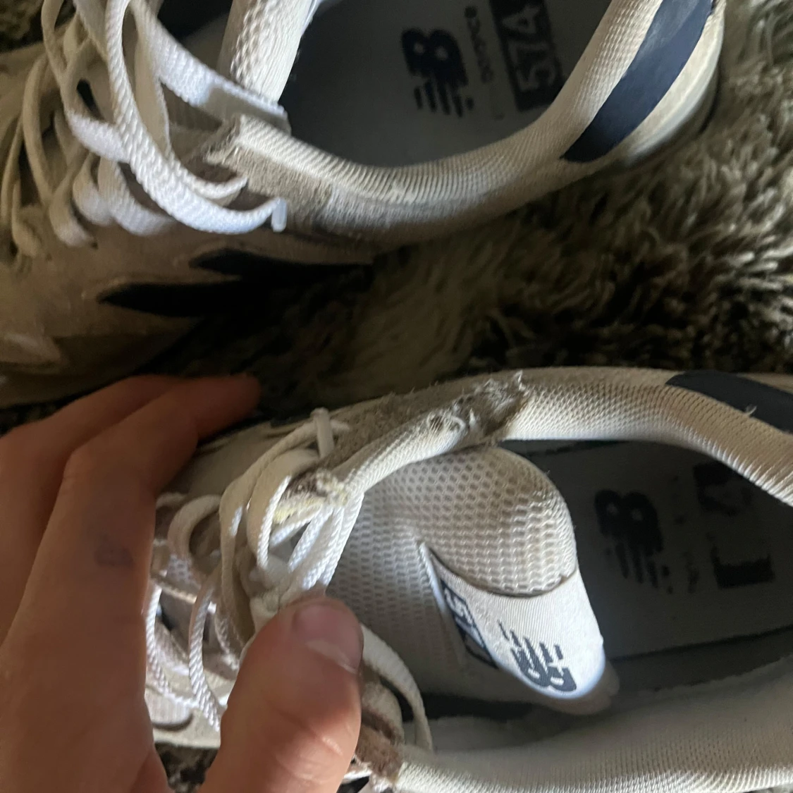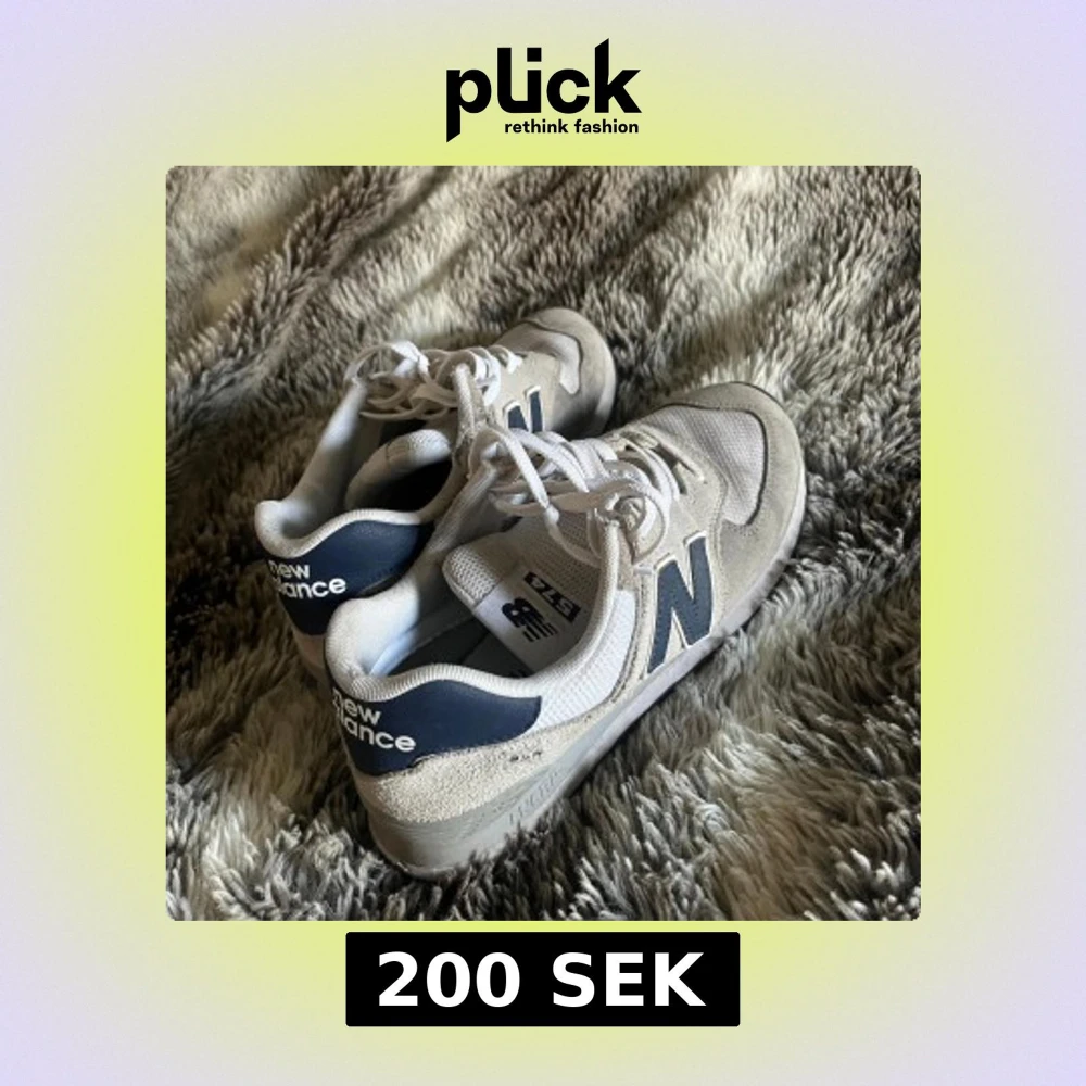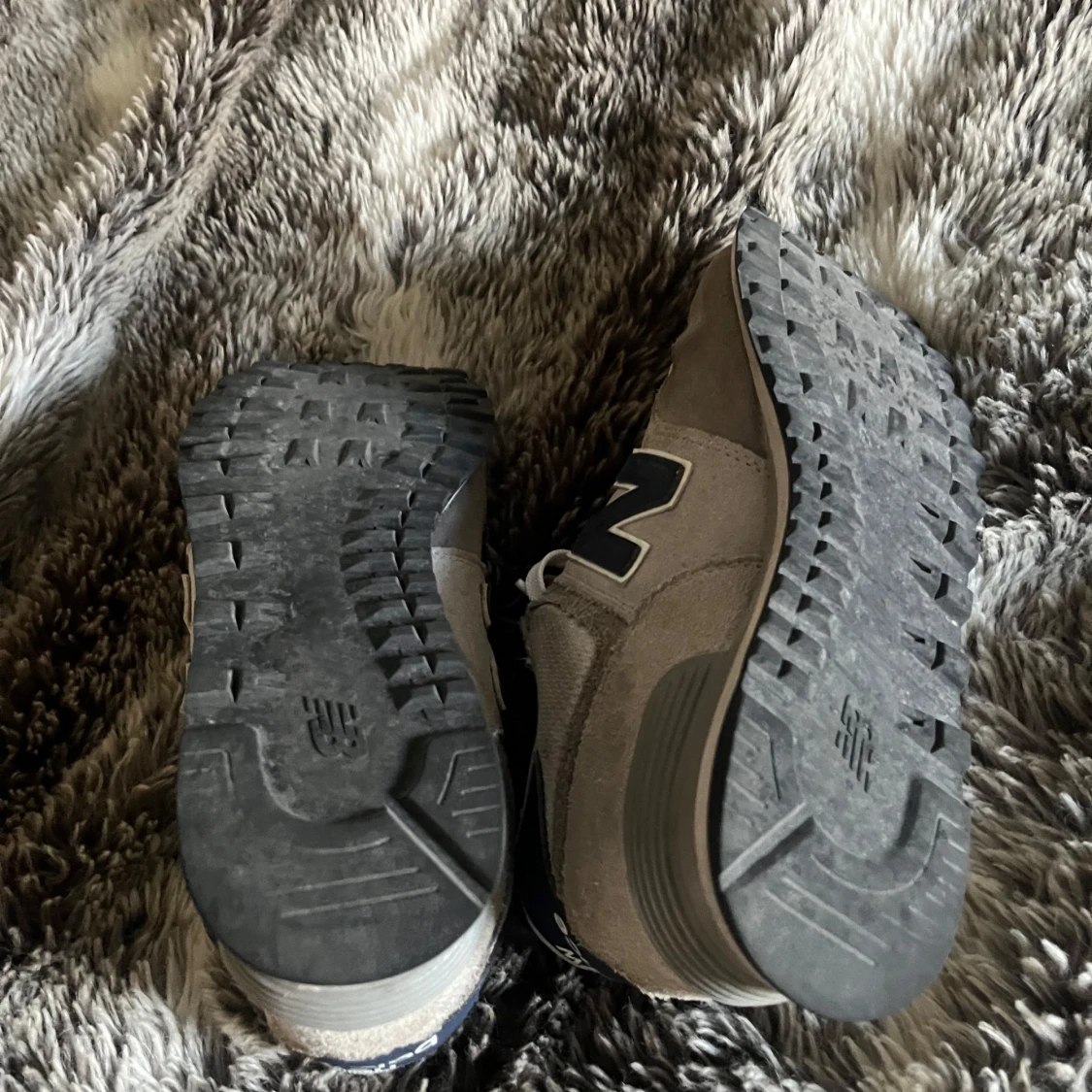 Snygga New Balance 574 sneakers i beige mocka och mesh med blå detaljer och vit sula. Klassisk retrostil med stor N-logga på sidan och skön passform. Perfekta för dig som gillar streetwear och sportig vibe.