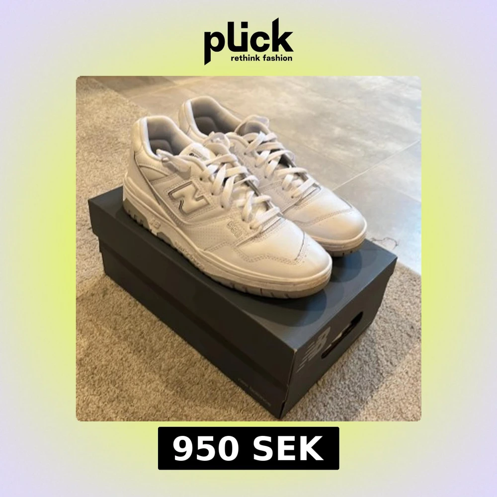 Säljer ett par fräscha New Balance 550 sneakers i helvitt. Modellen har en chunky siluett, perforerade paneler och tydlig NB-logga på sidan och hälen. Skorna har snörning och platt sula, tillverkade i skinn och syntet. Perfekt för dig som gillar cleana och sportiga vibes. Andvänt 2-3 gånger