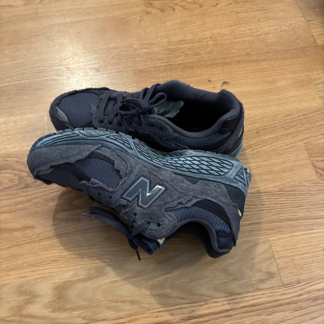 Säljer ett par mörkgrå New Balance 2002R sneakers med mesh och mocka-paneler. Skorna har en chunky sula, snörning och den klassiska N-loggan på sidan. Perfekta för dig som gillar streetwear och vill ha en bekväm och snygg sneaker till vardags.