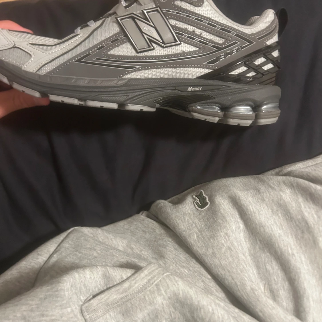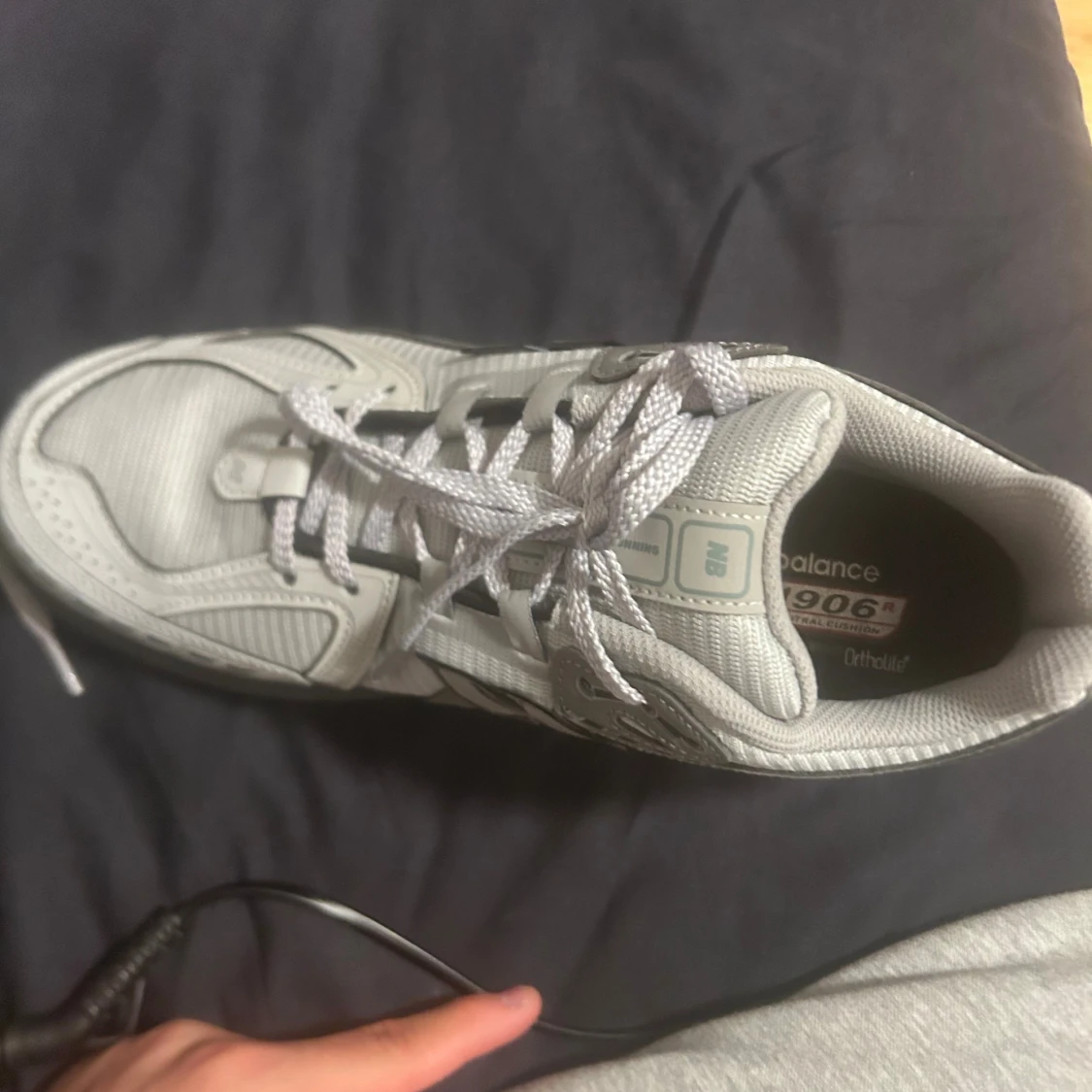 Säljer ett par New Balance 1906R sneakers i grått och silver. Skorna har mesh- och syntetpaneler, coola detaljer och en chunky sula med dämpning. Klassisk snörning och NB-logga på sidan. Perfekta för dig som gillar sportig och trendig stil.