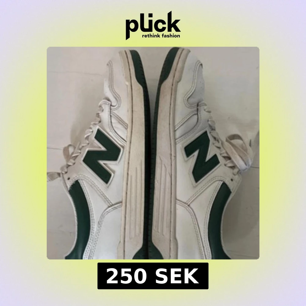 Säljer ett par klassiska vita New Balance 480 sneakers med gröna detaljer och stor N-logga på sidan. Skorna har snörning och en platt sula, perfekt för en sportig och stilren look.